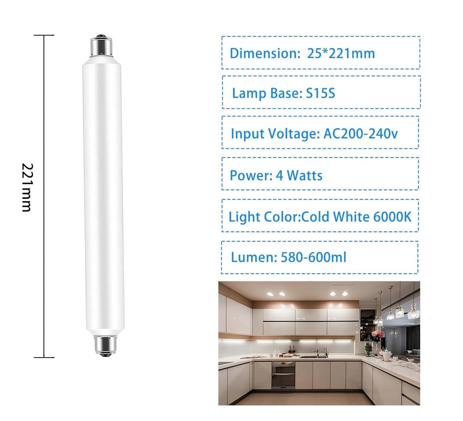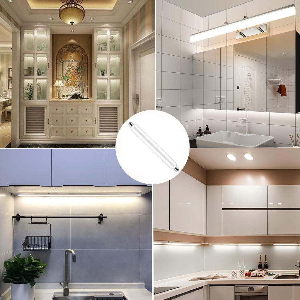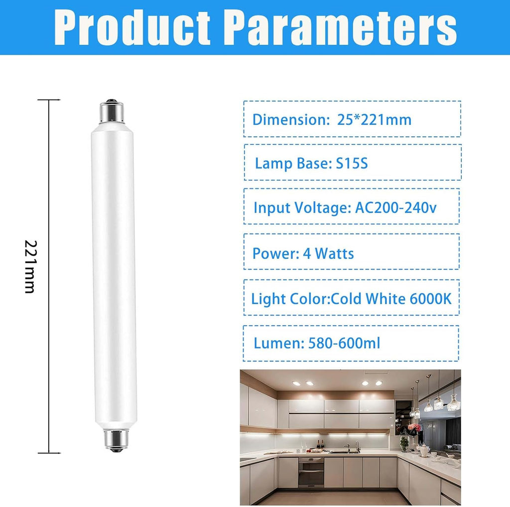 4W S15s LED Strip Tube Light Bulb, 221mm, Cold White 6000K, Energy-Efficient Shaving Light Replacement for 40W T25 Tubular Bulbs, Non-Dimmable