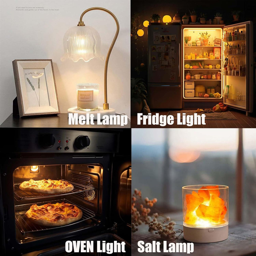 • 14 wax warmer bulb is made of high quality heat-resistant glass and high melting point solder, can withstand temperature up to 300°C that makes it suitable for use in lamps and fixtures that generate high heat, such as oven light bulb, wax melt light bulb.