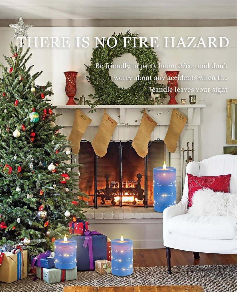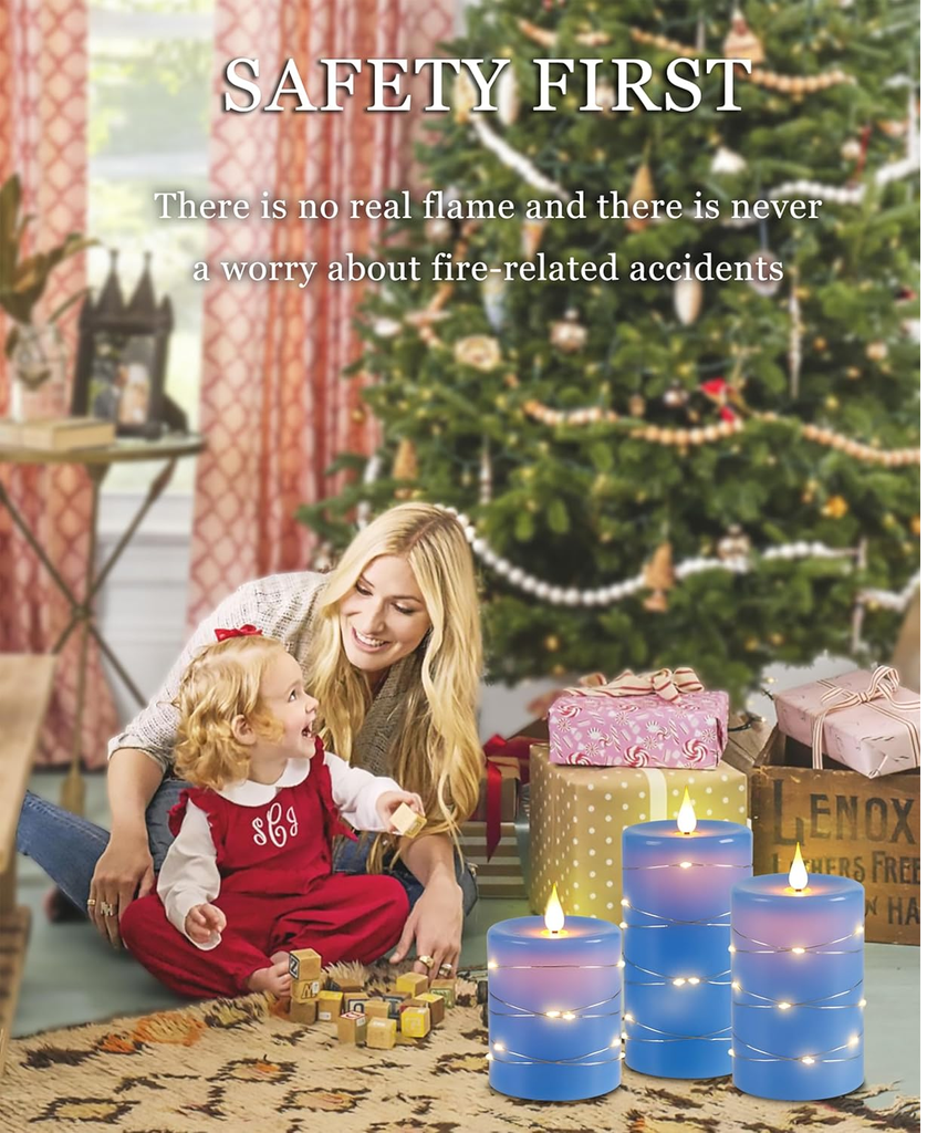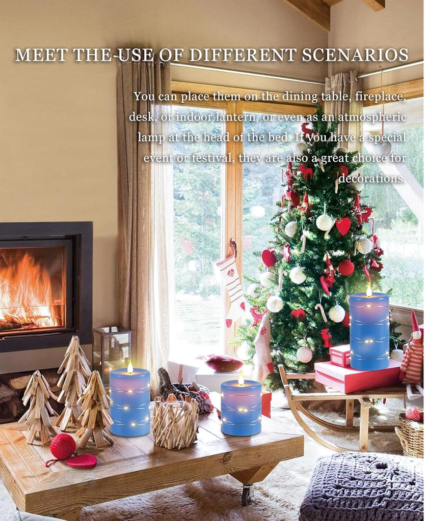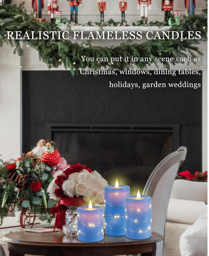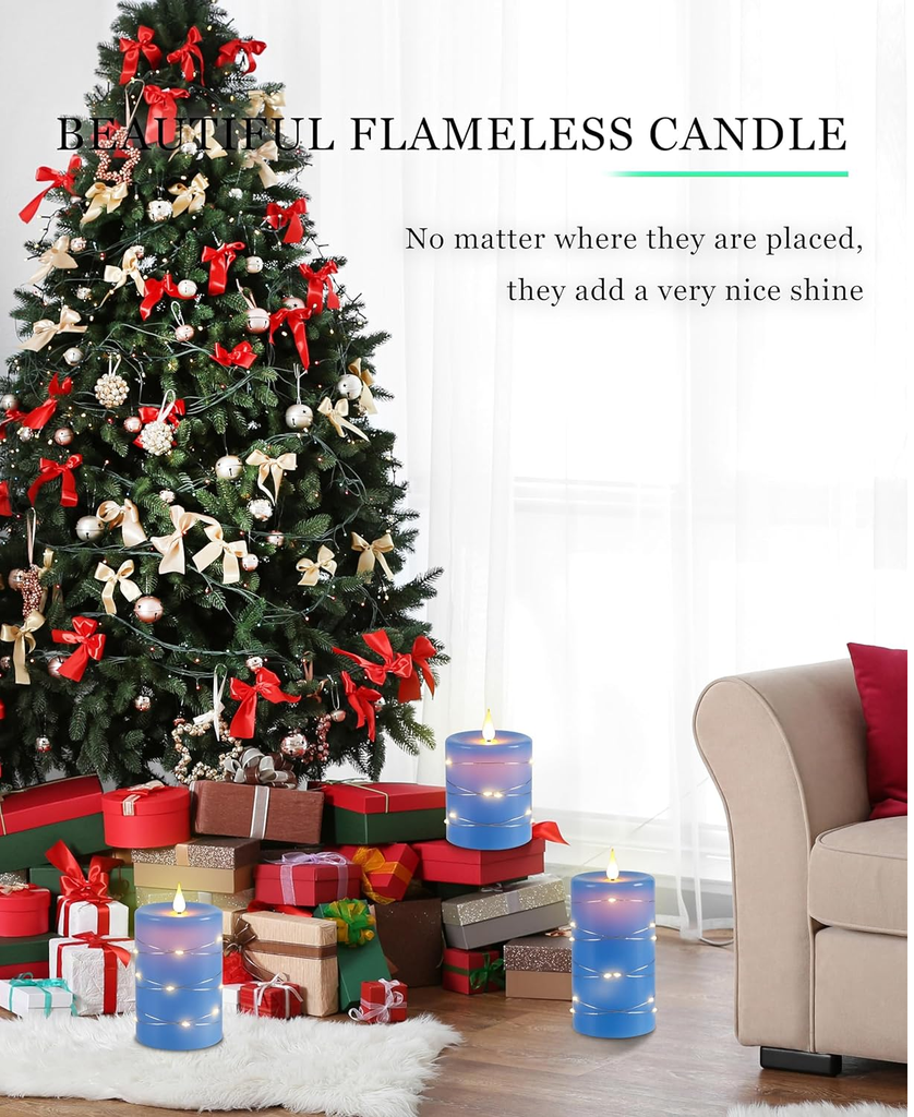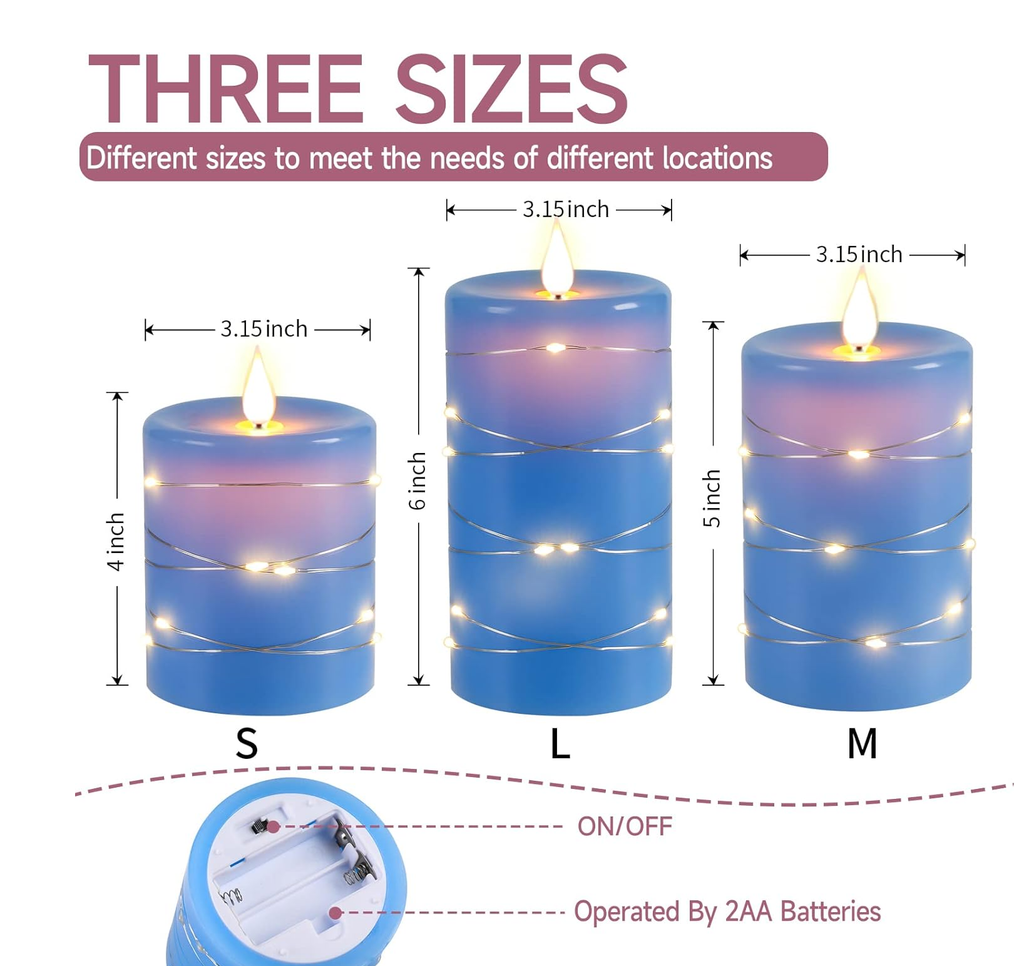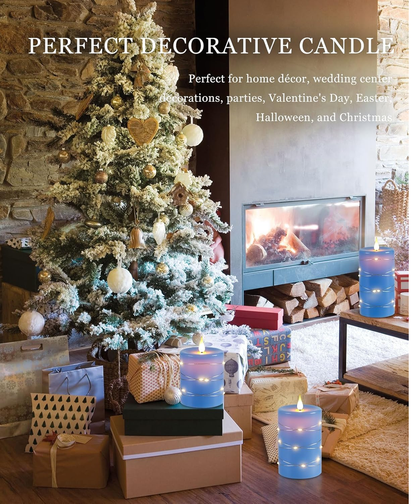 Enhance your home ambiance with this 3-Pack Flameless LED Candle Set, featuring a 360° realistic flickering flame effect, warm starry string lights, and a 10-key remote control for customized lighting. Made from real blue wax, these battery-operated candles offer a safe, elegant glow for bedrooms, weddings, Christmas décor, and modern interiors. With an auto-off timer (2H/4H/6H/8H) and battery-powered operation (2 x AA per candle, not included), these candles provide worry-free beauty without flames or melting wax.