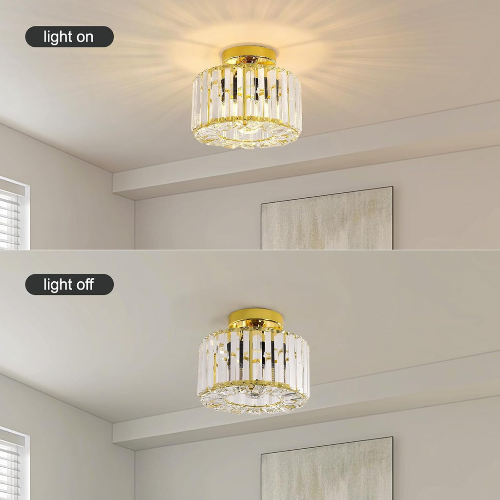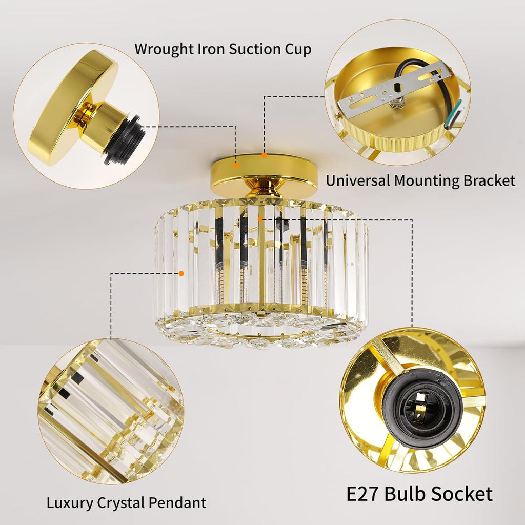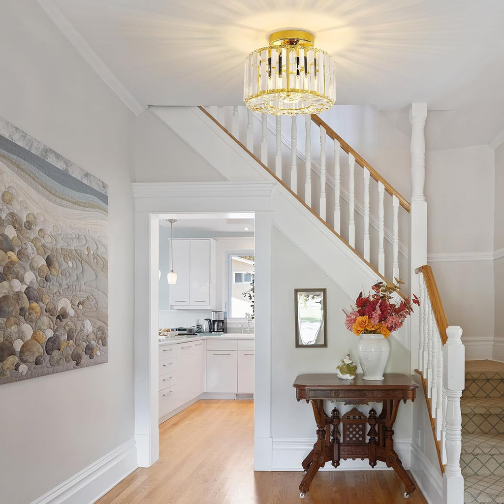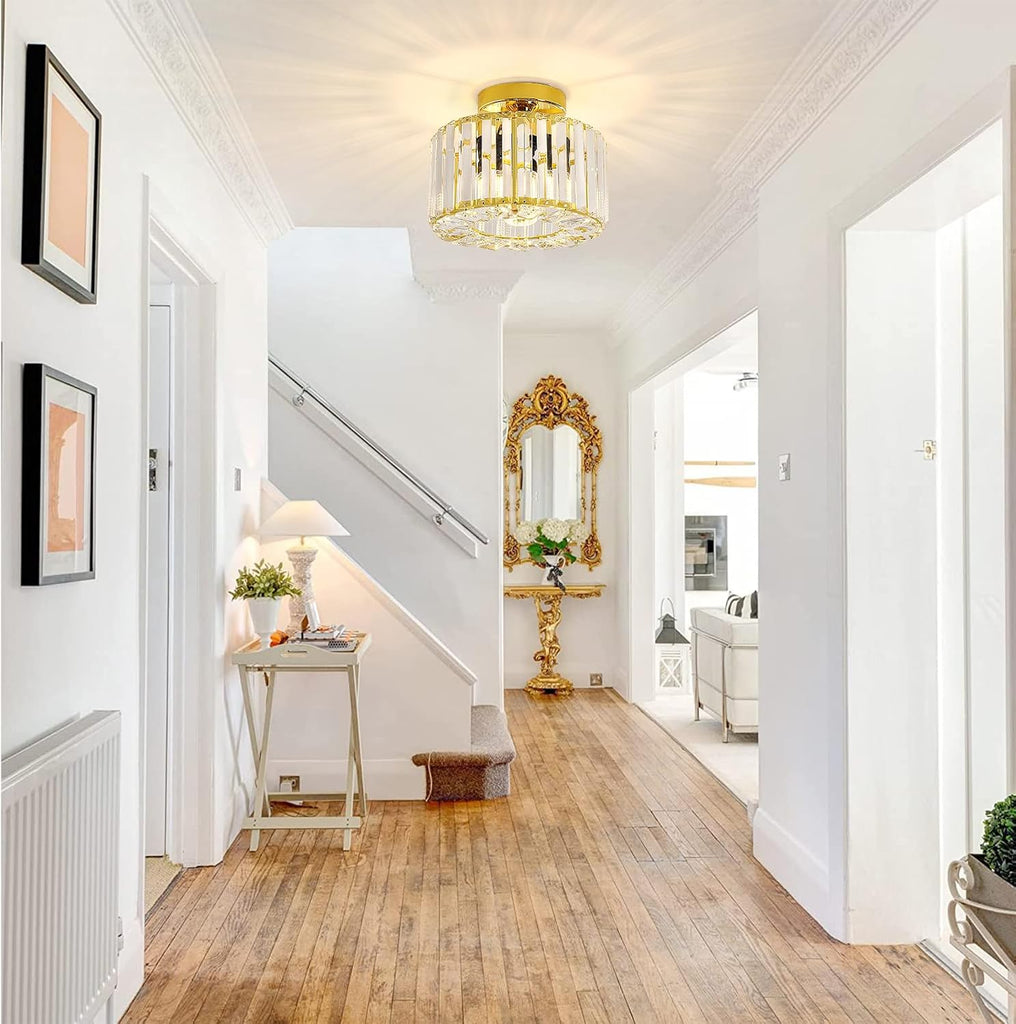 Enhance your living space with this elegant Gold Crystal Semi Flush Mount Ceiling Light from Easric. Combining industrial charm with modern sophistication, this fixture features a luxurious crystal chandelier shade that casts stunning light patterns, creating a warm and inviting atmosphere. Perfect for hallways, living rooms, dining areas, kitchens, and more, this light is both a practical and stylish addition to your home decor.