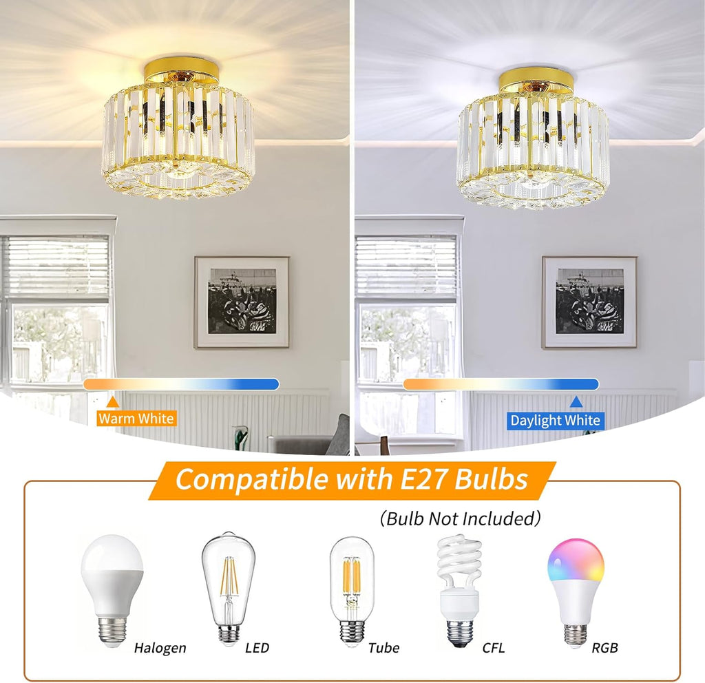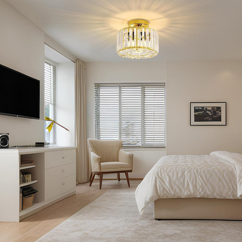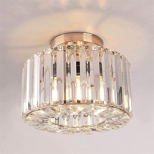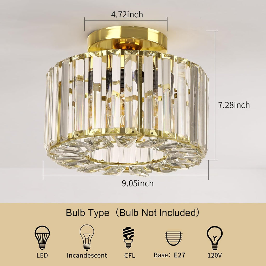 Enhance your living space with this elegant Gold Crystal Semi Flush Mount Ceiling Light from Easric. Combining industrial charm with modern sophistication, this fixture features a luxurious crystal chandelier shade that casts stunning light patterns, creating a warm and inviting atmosphere. Perfect for hallways, living rooms, dining areas, kitchens, and more, this light is both a practical and stylish addition to your home decor.