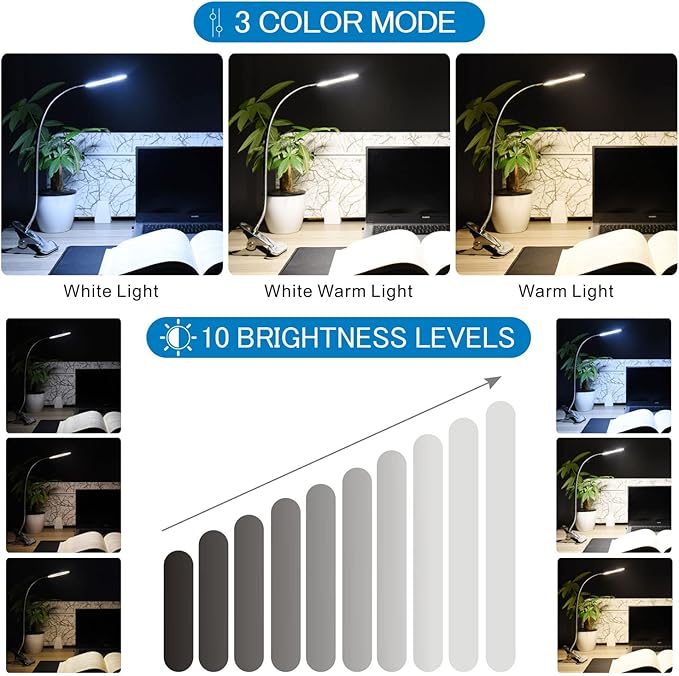 Light up your workspace or reading nook with the KNAMKY USB LED Desk Lamp. This clip-on reading light features 3 lighting modes, 10 adjustable brightness levels, and a flexible gooseneck design — making it ideal for studying, reading, video calls, or bedtime use. Eye-caring and USB powered, it brings efficient lighting wherever you need it.