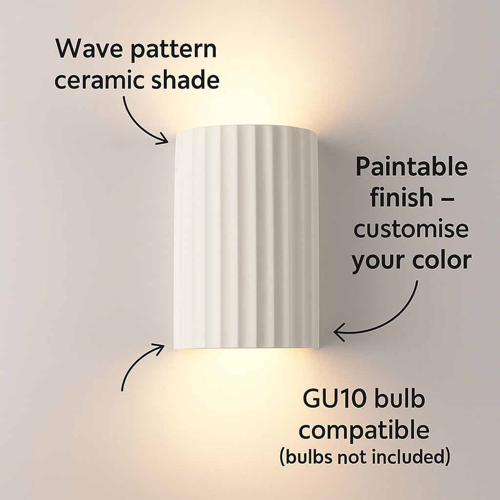 Elevate your interior with this stylish and versatile Up and Down Wall Light, designed to add both functionality and a touch of artistic flair to any room. With its elegant wave-pattern ceramic shade, this fixture combines modern design with customizable features—allowing you to paint or finish it to match your unique decor.