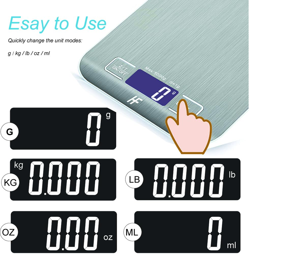 The HomeFashion Digital Kitchen Scale is a sleek and accurate tool designed for precise cooking, baking, and meal prep. With a maximum capacity of 5kg/11lb and accuracy down to 1g, it ensures reliable measurements for all your recipes. The stainless steel platform offers durability and a modern look, while the clear backlit LCD display makes readings easy in any lighting condition. Lightweight and compact, this multifunctional scale is perfect for weighing food, ingredients, parcels, and more—making it ideal for home, office, or even diet tracking.