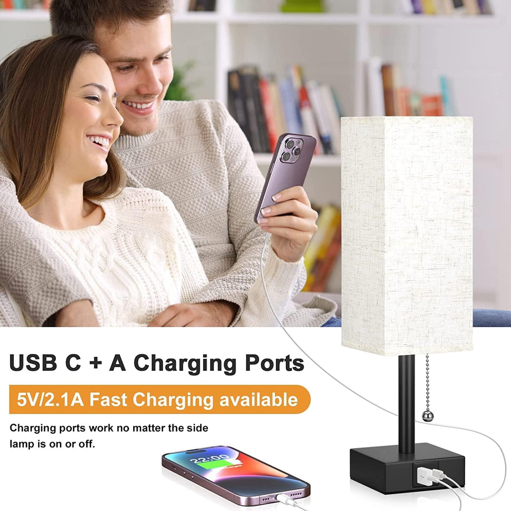 USB Bedside Table Lamp with 3 Color Modes & Pull Chain | Type-C & USB-A Charging Ports | Beige Fabric Shade | LED Bulb Included