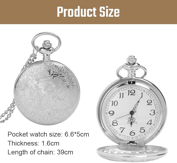 Add a timeless touch to your style with the Modern Quartz Pocket Watch with Chain, a perfect blend of classic charm and modern precision. Designed with elegant Roman numerals and a durable quartz movement, this pocket watch delivers both sophistication and reliability. Whether you’re dressing up for a formal occasion or looking for a thoughtful gift, this pocket watch is an excellent choice for birthdays, anniversaries, Christmas, or Father’s Day. Its stylish exterior features a polished metal finish and a matching chain for secure and convenient carrying. The watch opens with a smooth clasp, revealing a clear, easy-to-read dial that embodies traditional elegance. Crafted to complement any outfit, this pocket watch is not just a timepiece—it’s a statement of refinement and heritage.