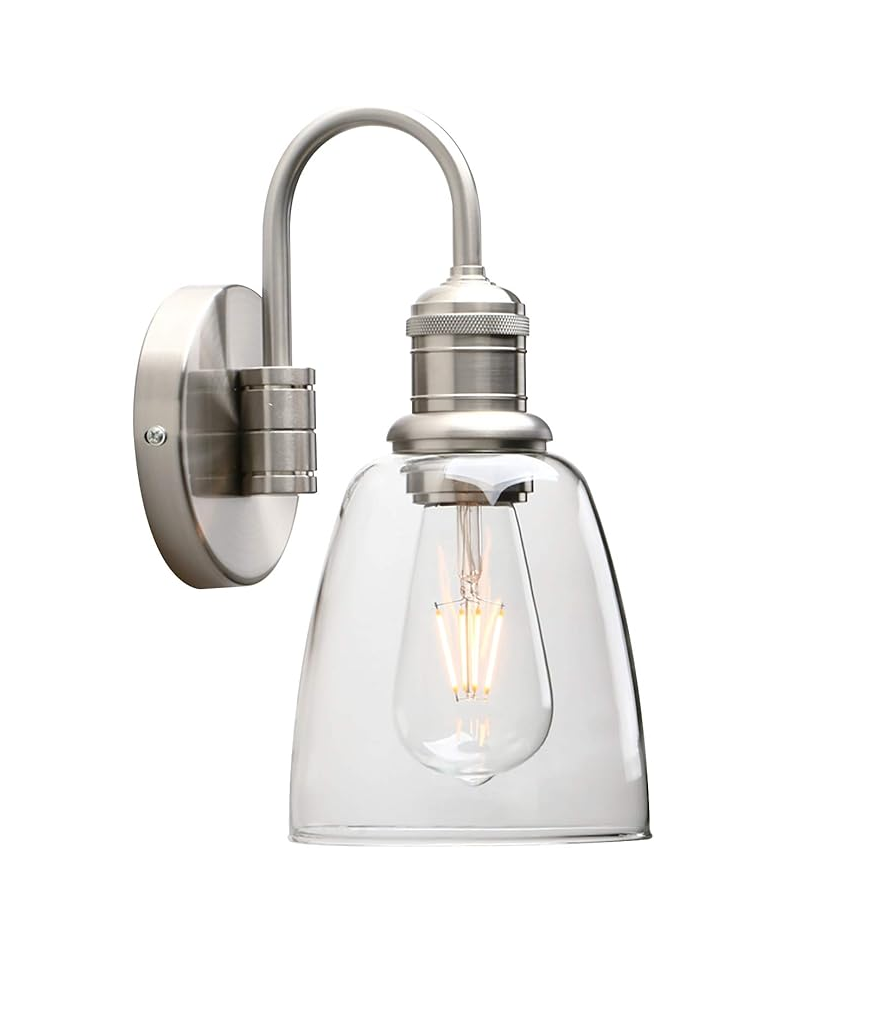 Add timeless industrial charm to your space with this Vintage Bell Sconce Wall Light. Featuring an antique brushed finish and a high-quality, shatterproof 5.6" clear glass shade, this versatile fixture suits a wide range of interiors. Whether installed facing up or down, it enhances any setting—from cozy bedrooms to stylish loft bars—with a warm, vintage ambiance.