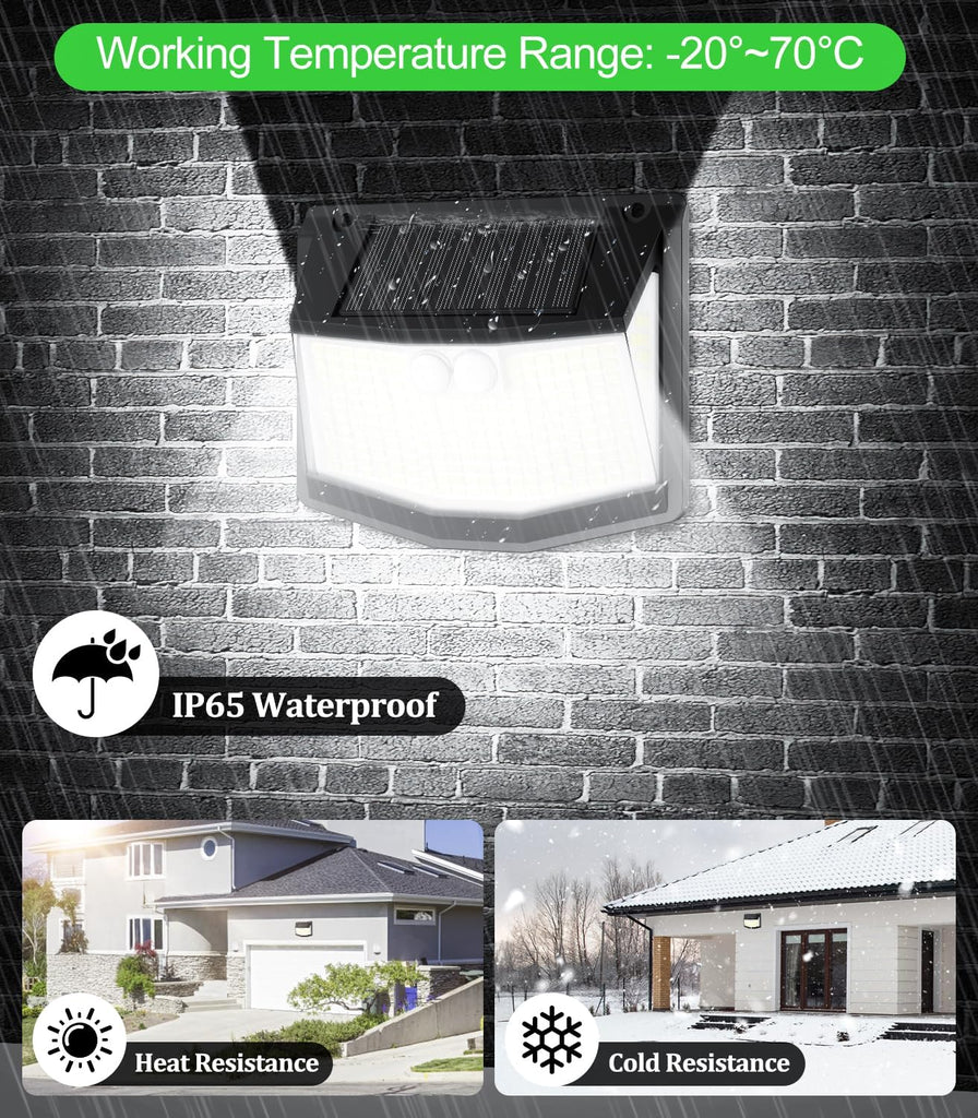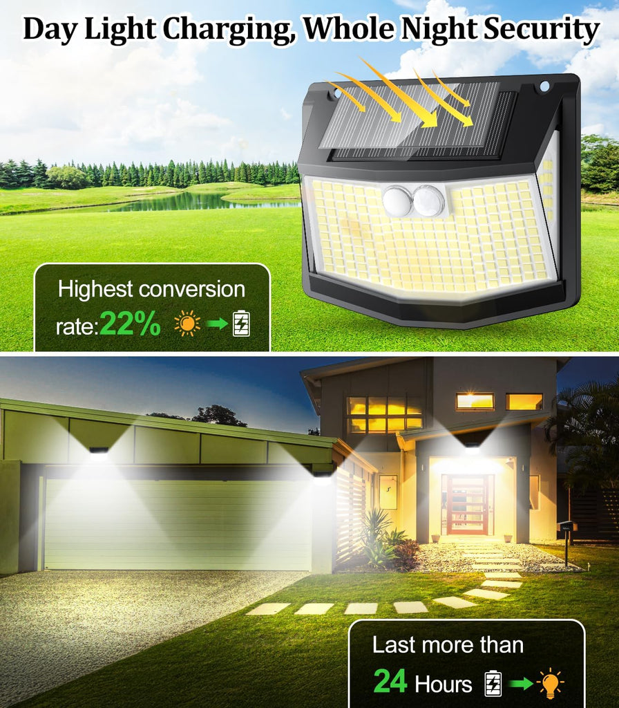 Illuminate your outdoor spaces efficiently with the LED Solar Motion Sensor Lights 2 Pack. Each light is equipped with 248 ultra-bright LEDs, offering a 270° wide lighting angle to cover more area. With a motion sensor range of up to 8 meters and three versatile lighting modes, these lights are ideal for enhancing security in your yard, garden, or garage. Built with durable ABS material and boasting an IP65 waterproof rating, they are designed to withstand various weather conditions