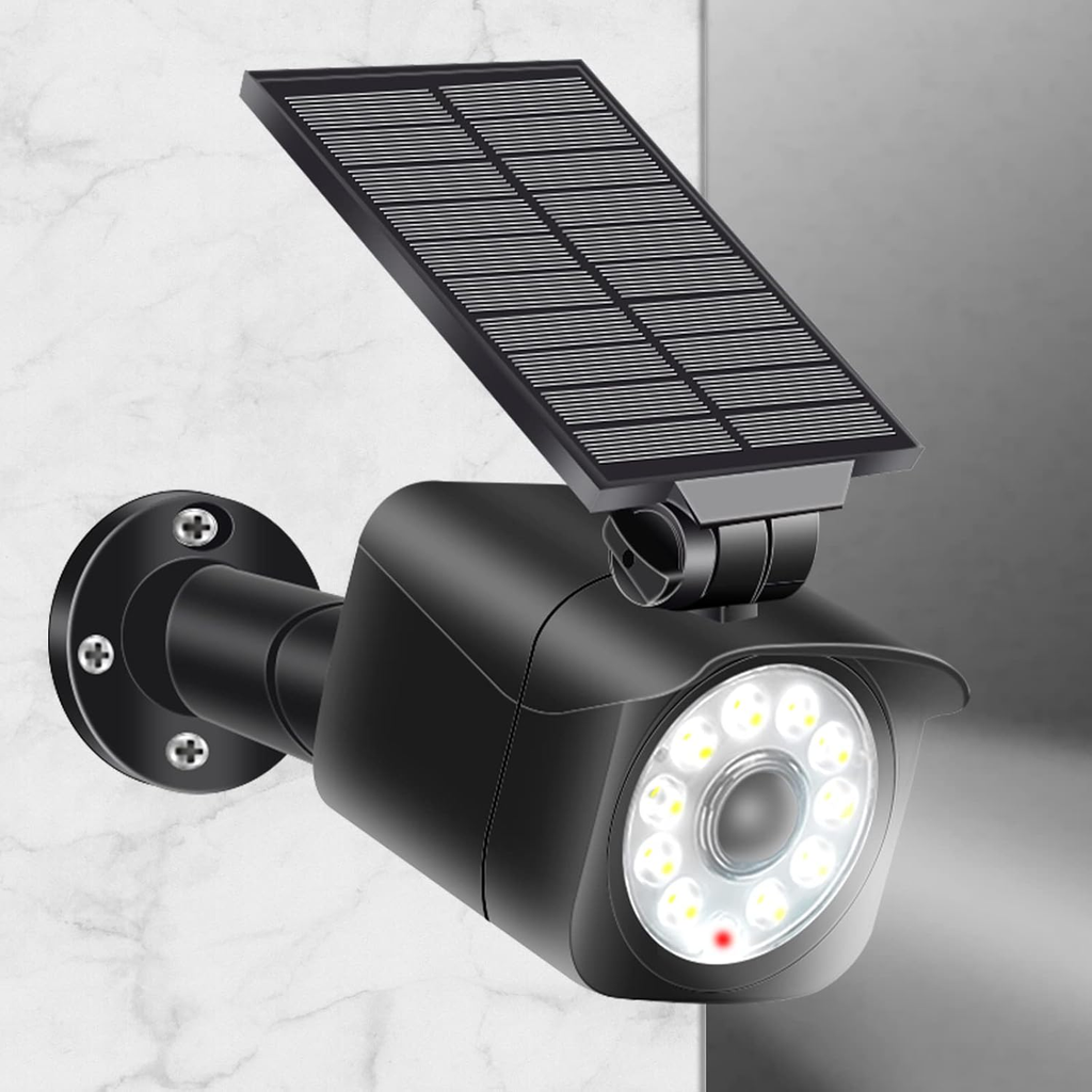 This solar-powered LED floodlight features a PIR motion sensor and dummy camera design, combining security lighting with deterrent effect. With 1000LM brightness and IP65 waterproof protection, it’s perfect for gardens, garages, and backyards.
