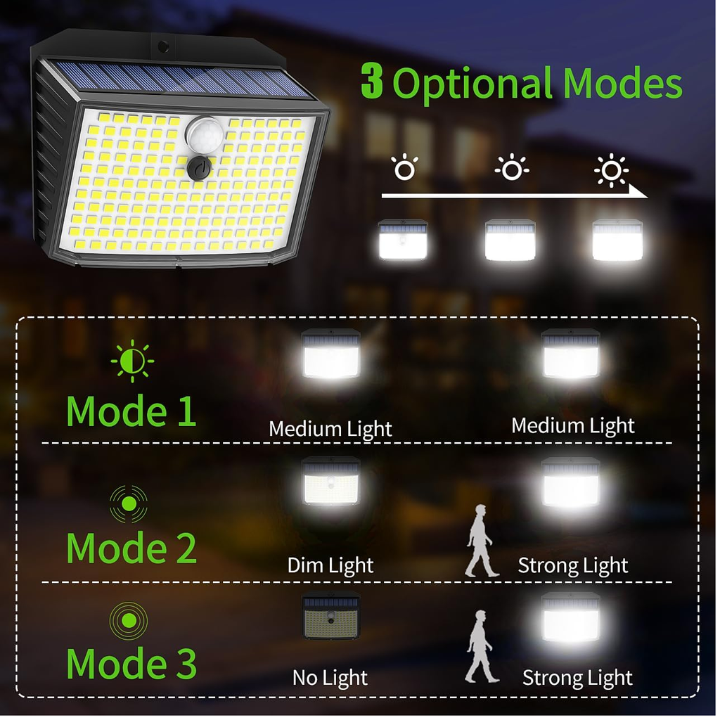 Upgrade your outdoor lighting with this 4-pack of Solar Detection Security Lights, equipped with 246 ultra-bright LEDs per unit. Each light delivers 2000 lumens of output with 270° wide-angle coverage, ideal for large outdoor areas. With IP65 waterproof protection and motion-activated functionality, these wall-mount lights are perfect for driveways, gardens, and patios.