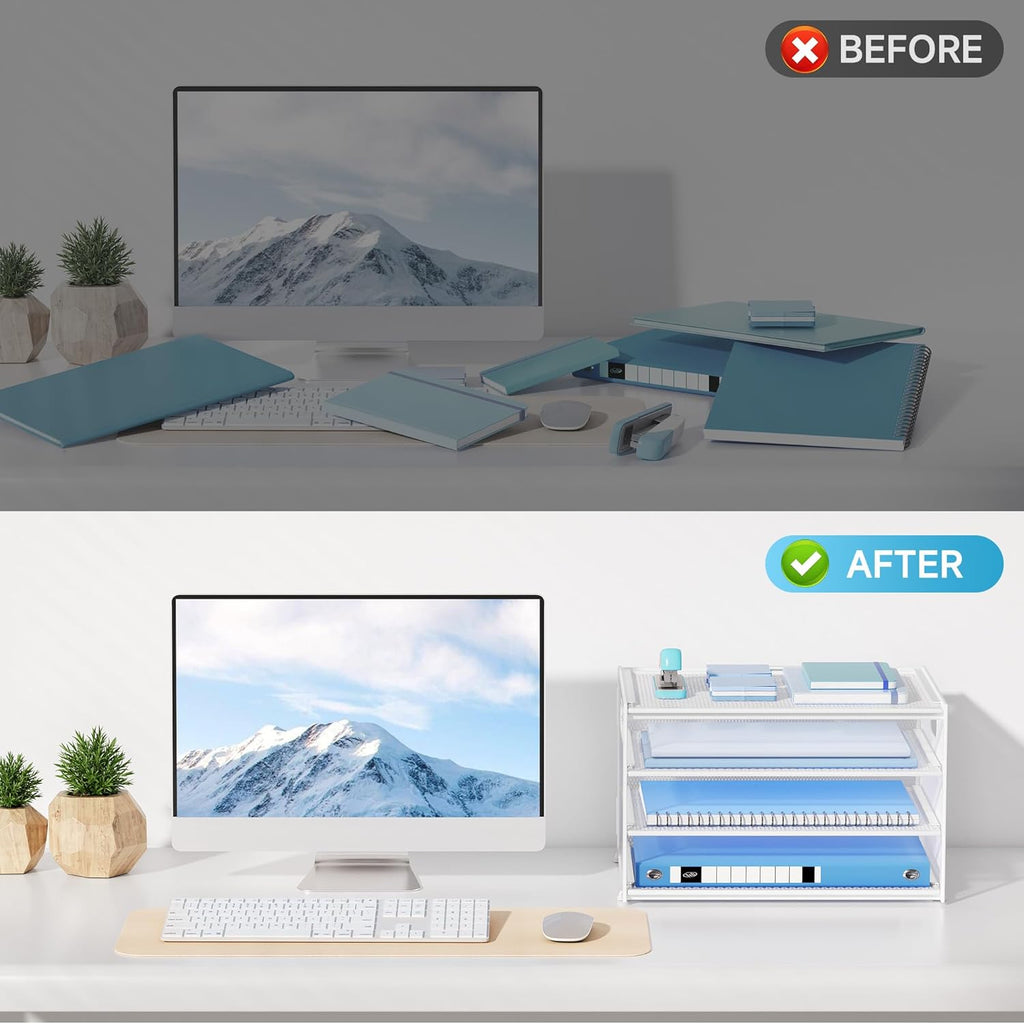 Keep your workspace neat, efficient, and stylish with this 4-Tier Mesh Desk Organiser with Handle. Designed to provide practical storage and easy access to your documents, magazines, and office supplies, this organiser is perfect for maintaining order on your desk. The four spacious letter trays allow you to store and categorise A4 papers, files, notebooks, and folders, while the built-in magazine holder provides vertical storage for larger items.