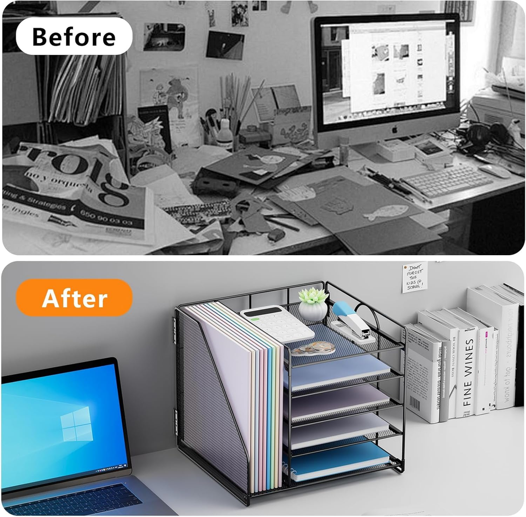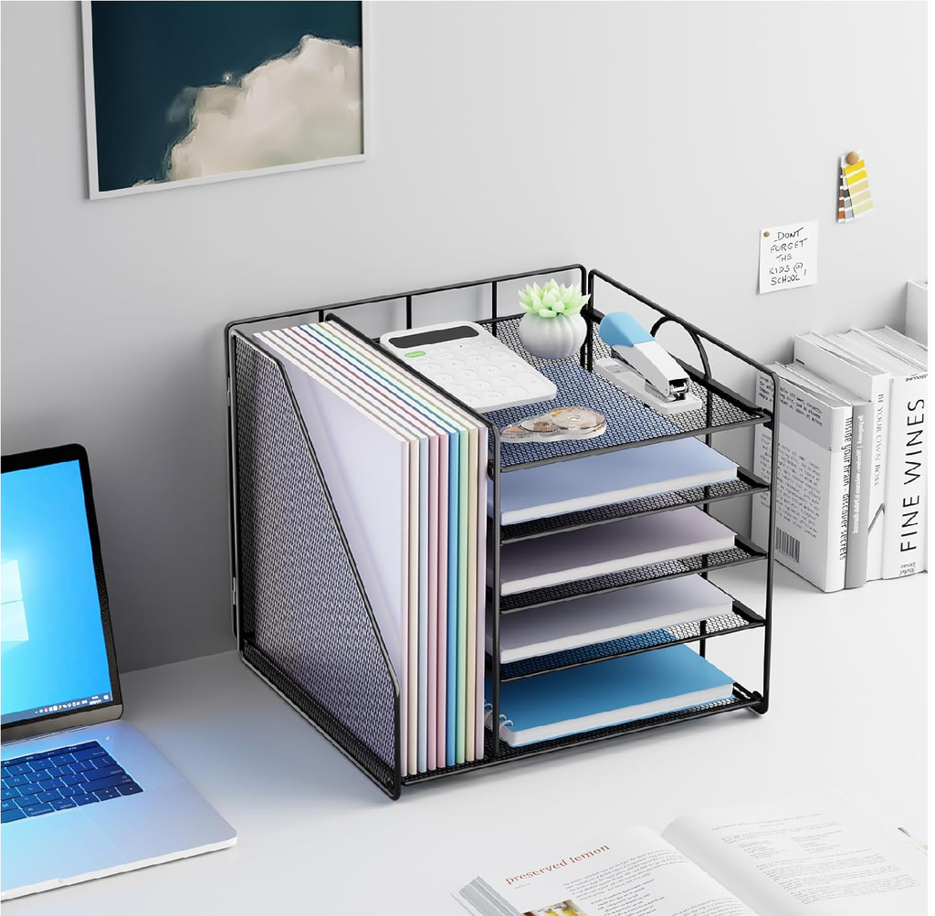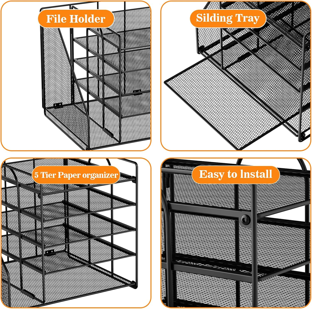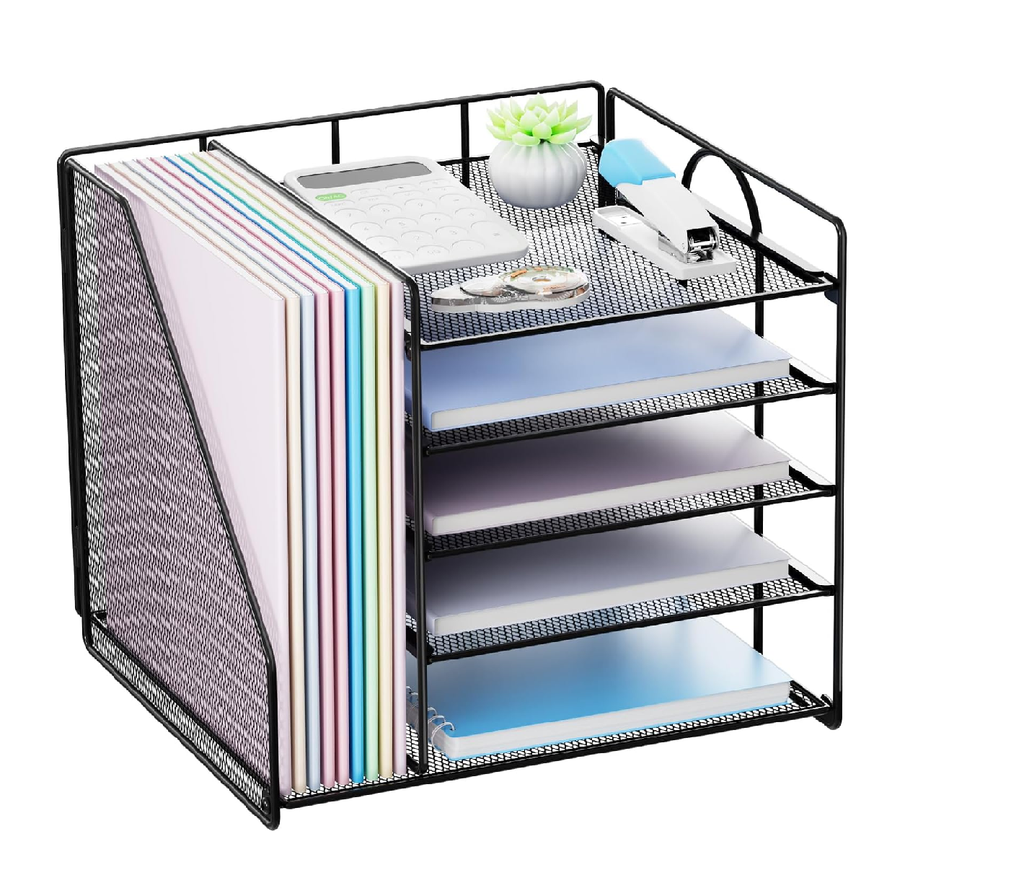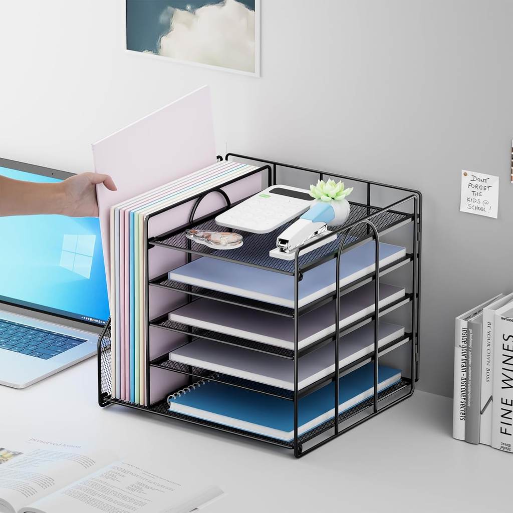 Crafted from durable metal mesh, this organiser ensures stability, visibility, and ventilation for papers and folders. The five spacious sliding trays allow you to sort letters, A4 documents, and notebooks, while the side file holder keeps folders, books, and magazines upright and within reach.