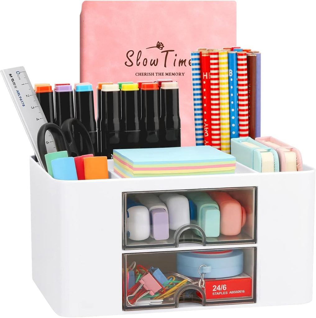 Seven compartments for storing pens, scissors, clips, and office supplies.