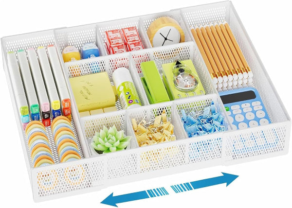 Keep your desk tidy and organised with this Desk Organiser with Mesh Tray and 10 Adjustable Compartments. Designed for versatility, it features five removable dividers that allow you to customise the storage space to fit pens, stationery, office supplies, makeup, or small household items. Made from durable mesh material, this organiser is sturdy yet lightweight, offering a practical and stylish solution for both home and office use. Its sleek white design complements any décor while keeping your workspace clutter-free. Perfect for sorting small items efficiently, this organiser helps you save time and maintain a neat, professional, and functional environment.