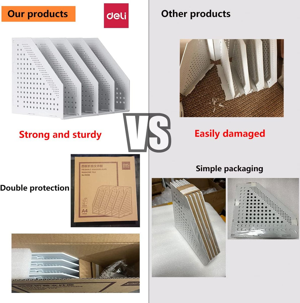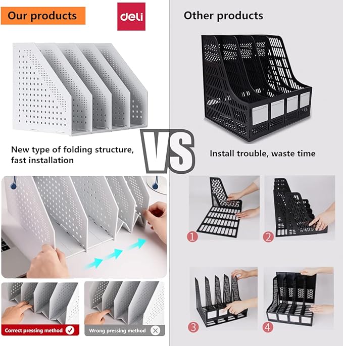 The File Holder Folding Bookshelf is the perfect desk organizer for keeping your workspace neat, efficient, and professional. Designed with four vertical compartments, this magazine file holder provides ample space to store documents, folders, notebooks, and magazines in an organized manner. Its foldable design makes it easy to assemble, store, and carry, allowing you to save space when not in use.
