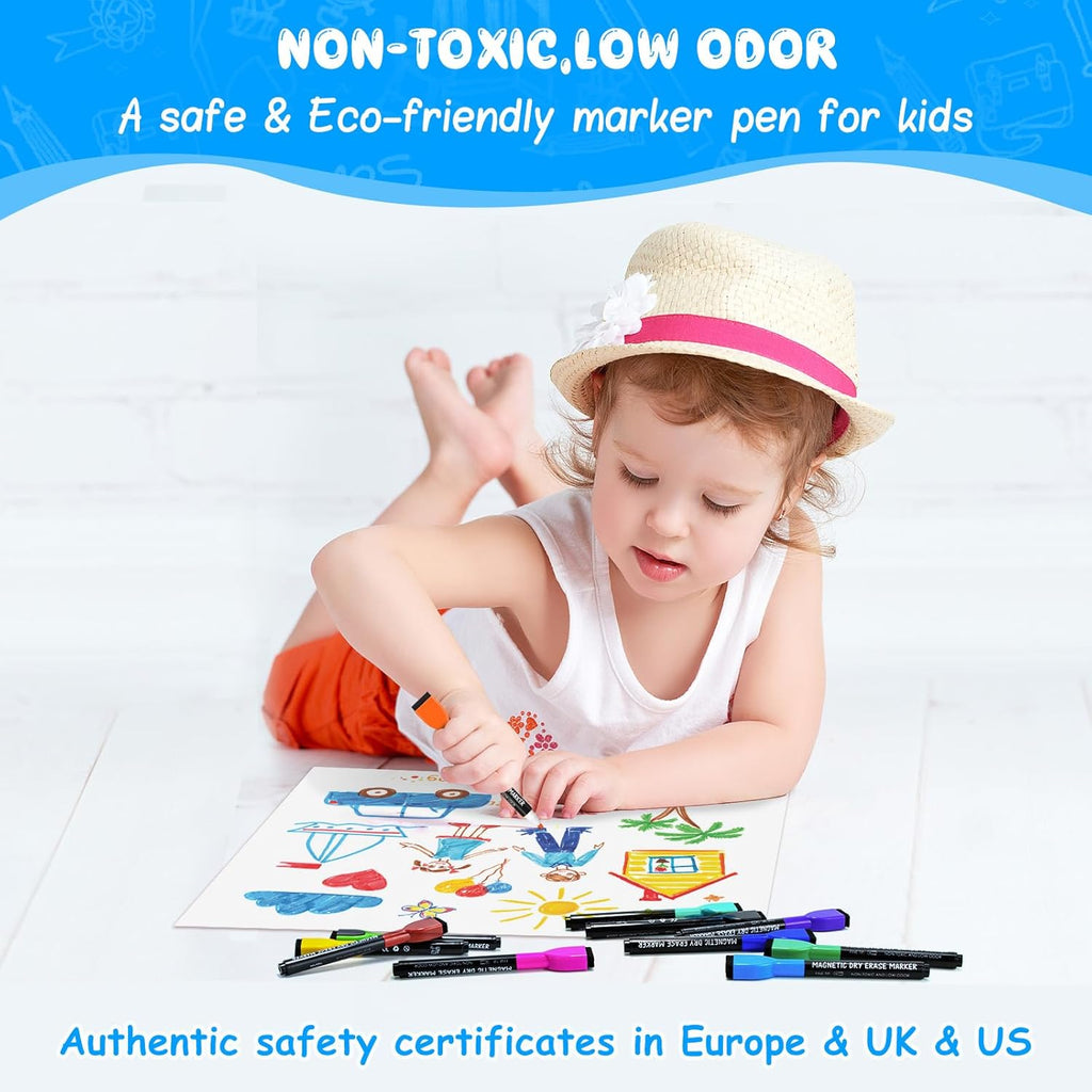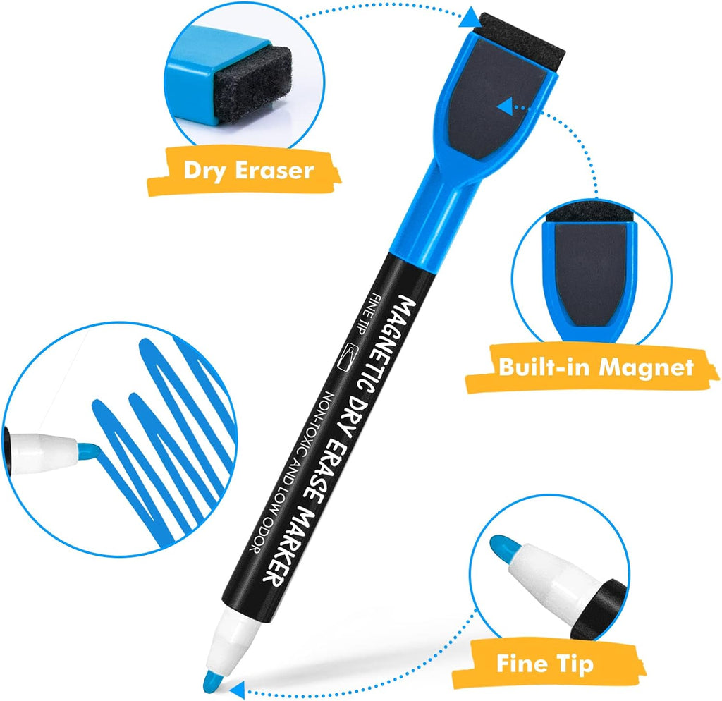 Enhance your whiteboard experience with this 12-Pack of Magnetic Whiteboard Markers, perfect for classrooms, offices, and home use. Each marker comes in a vibrant, bright colour to make your notes, drawings, and presentations stand out. The fine tip design allows for precise writing and detailed diagrams, making it ideal for charts, schedules, or creative work. These markers feature low-odour ink, making them safe and comfortable to use in enclosed spaces without strong chemical smells. The erasable, dry-wipe formula ensures that all markings can be removed easily without leaving residue, smudges, or ghosting on the whiteboard. This makes them suitable for repeated use and keeps your whiteboard clean and professional-looking.