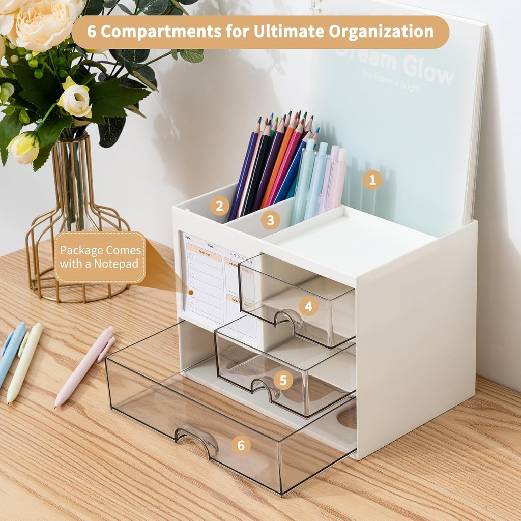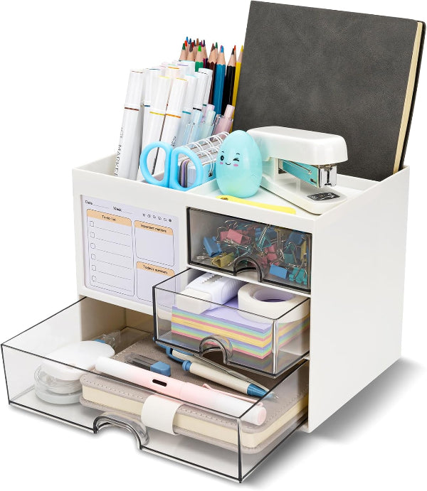 Keep your workspace or vanity clutter-free with this White Desk Organizer with 3 Drawers. Designed for both functionality and elegance, this large-capacity organizer provides ample space for storing stationery, office accessories, cosmetics, and other daily essentials. Whether on your office desk, study table, or dressing area, it helps you maintain a clean, organized, and efficient environment. Crafted from high-quality, durable plastic, the organizer features three spacious drawers for small items like pens, paper clips, sticky notes, or makeup tools, along with a top compartment for frequently used accessories. Its sleek white finish complements any modern workspace or home décor, while its compact design maximizes storage without taking up much space.