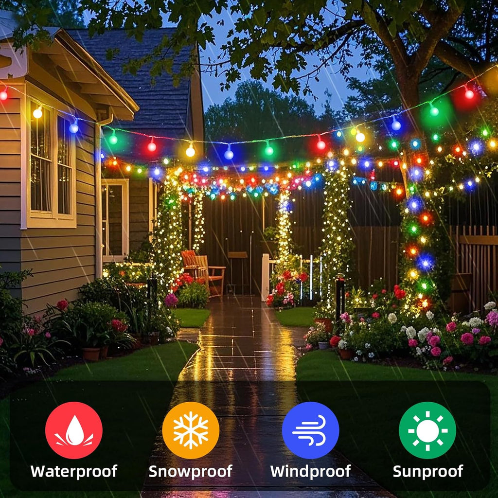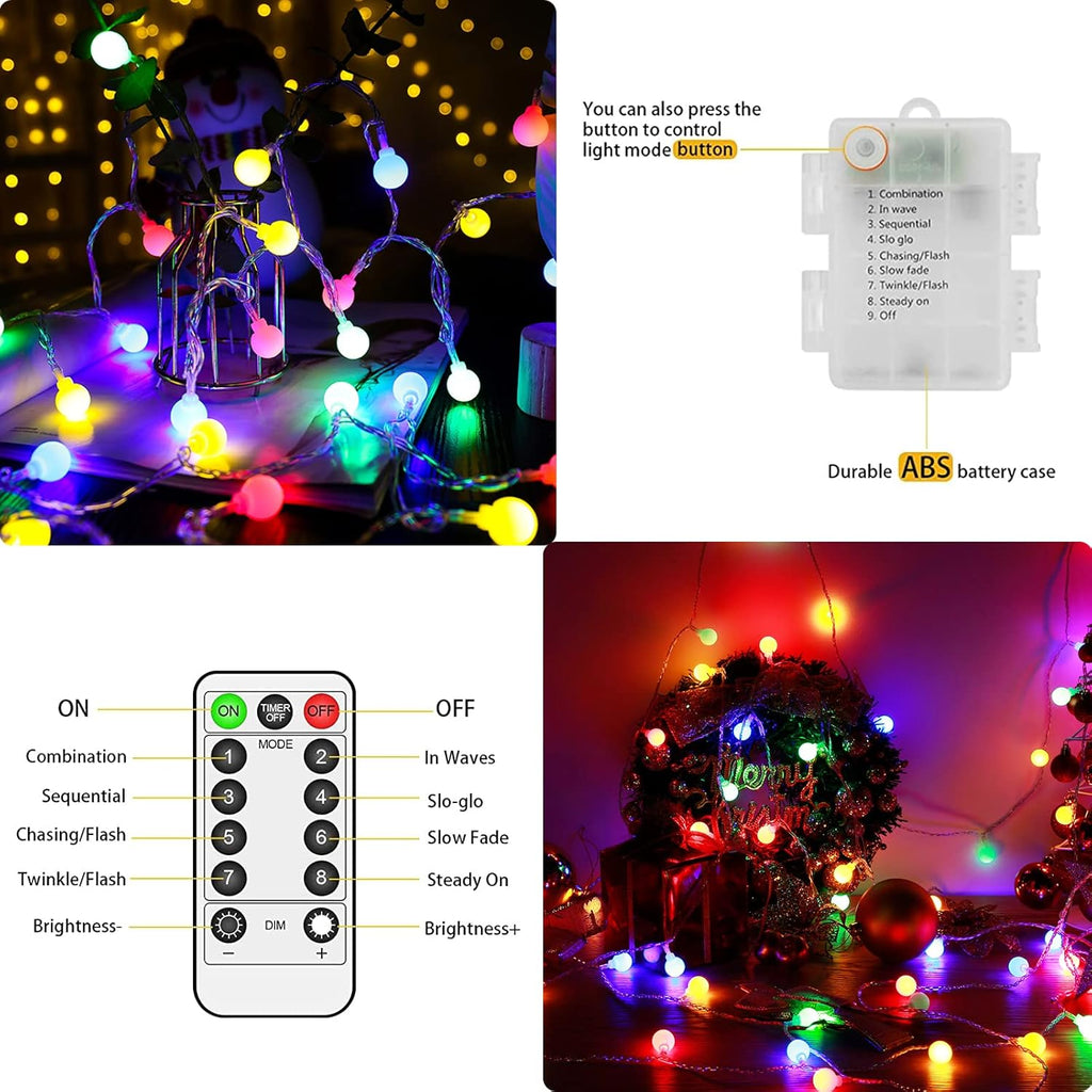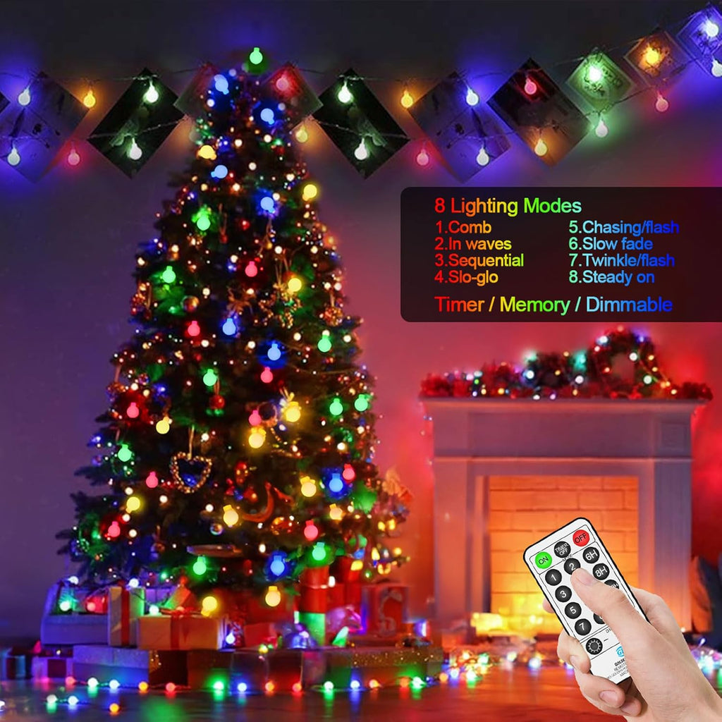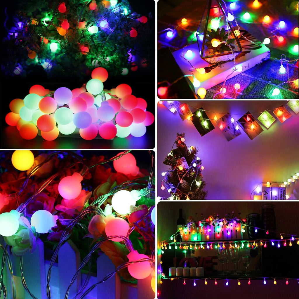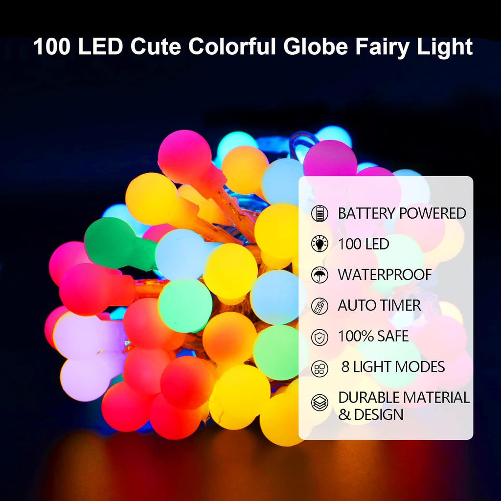 Illuminate your space with these 12-meter 100 LED Multicolor Globe Fairy Lights, perfect for both indoor and outdoor use. Battery-powered and waterproof, these lights offer flexibility in placement without worrying about cords. Featuring 8 lighting modes and a built-in timer controlled via remote, they create the ideal atmosphere for Christmas, birthdays, weddings, or everyday decoration.
