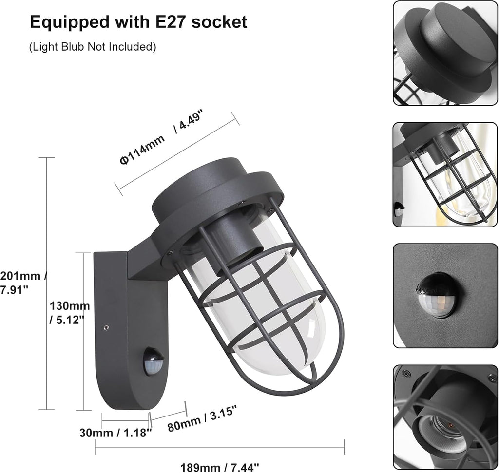 Illuminate your outdoor space with this Mains Powered PIR Motion Sensor Wall Lantern Light. Featuring an adjustable sensor with 110° detection angle and up to 10m range, this wall light provides both security and style. Made from powder-coated aluminum and clear glass with an IP44 waterproof rating, it is durable, rust-resistant, and weatherproof. The E27 socket allows you to use LED, fluorescent, or incandescent bulbs (not included), making it versatile for any home exterior.