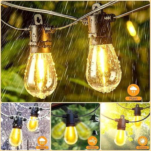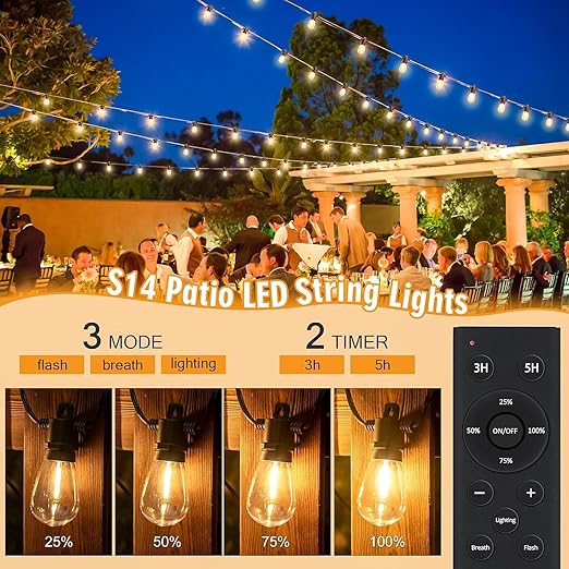 Brighten up your outdoor space with these 200FT (60M) Mains Powered Festoon Lights, featuring 60+2 energy-efficient, shatterproof S14 LED bulbs. With a convenient remote control, you can easily adjust brightness levels or select between 3 lighting modes: steady, breathing, or flashing. Built with IP65 waterproofing and durable PET construction, these festoon lights are perfect for gazebos, porches, patios, and outdoor events like weddings or birthdays. Safe, energy-saving, and incredibly easy to install, they offer reliable performance year-round.