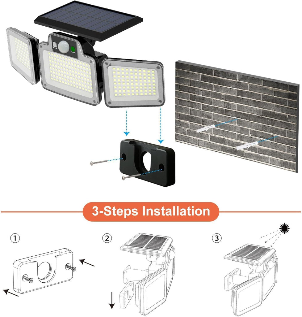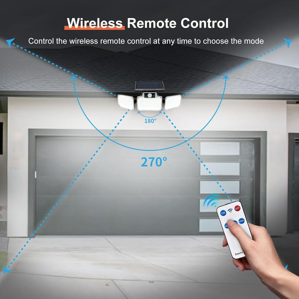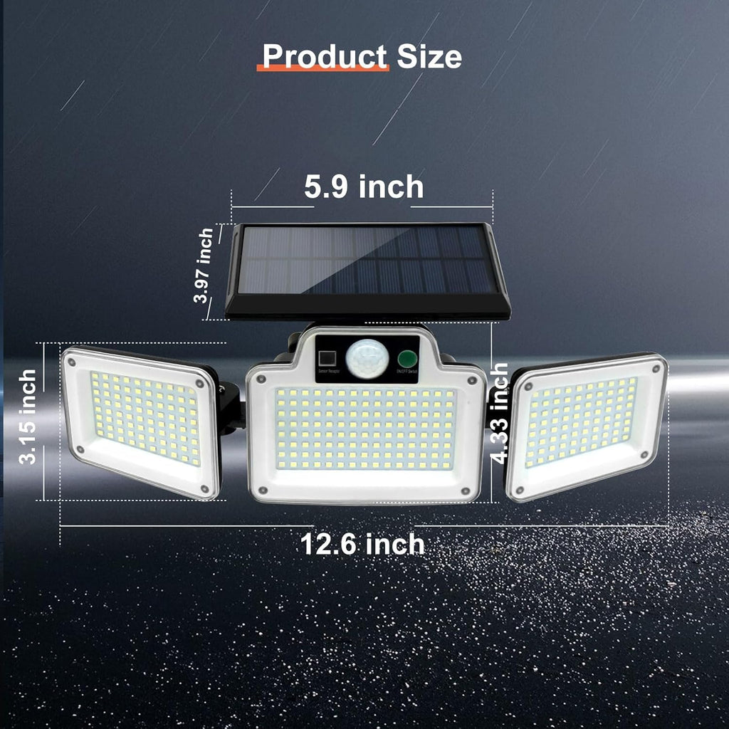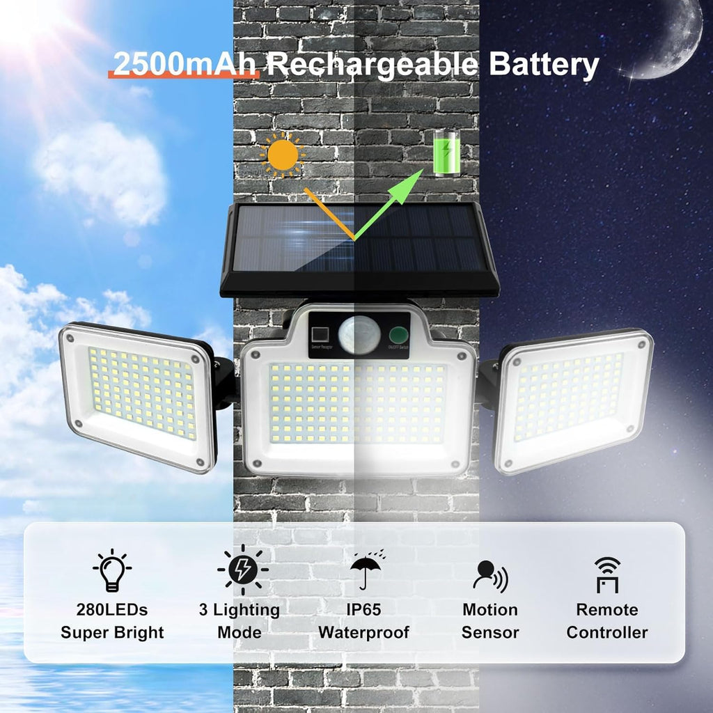 Illuminate your outdoor space with confidence using the 280 LED Solar Security Light. Designed with three adjustable heads for 270° wide coverage, this motion-activated solar light delivers powerful brightness where you need it most. Featuring 3 lighting modes, IP65 waterproof protection, and convenient wireless installation, it’s ideal for securing your home’s exterior—be it the yard, driveway, garage, or porch. With solar-powered efficiency and remote control convenience, it brings safety and sustainability together in one sleek unit.