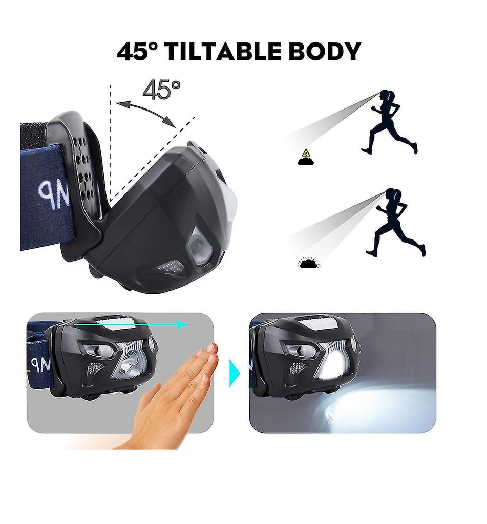 A headlamp is measured at 60*45*36mm, and the whole thing (headlamp, battery and strap) weighs 72g. It’s super compact and lightweight. With the adjustable and elastic strap, wear it on and you won’t feel a thing. There is a 60° adjustable angle on the headlamp, so you can easily shoot the beams on the ground in front of you when you’re jogging or dog walking at night.