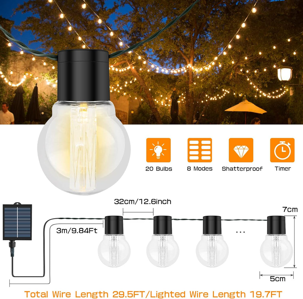 Illuminate your outdoor spaces with these upgraded 9-meter Solar Festoon Lights featuring 20 warm white G50 bulbs. Designed for easy installation and versatility, these lights come with a solar panel and USB charging options, a remote control with multiple lighting modes and brightness levels, and a durable, weatherproof design. Perfect for patios, gardens, weddings, parties, and year-round outdoor decoration.