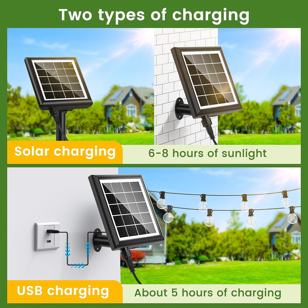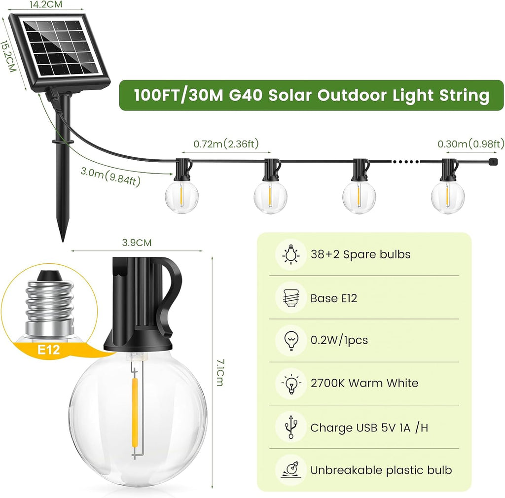 Enhance your outdoor space with these 100FT (30M) G40 Solar Powered Festoon Lights. Featuring 38+2 LED globe bulbs, a remote-controlled dimmer, 8 dynamic modes, and a durable waterproof design, these solar string lights provide charming and customizable lighting for patios, fences, pergolas, and more. With dual-mount installation options and a long-lasting solar panel, this set combines beauty, functionality, and ease of use.