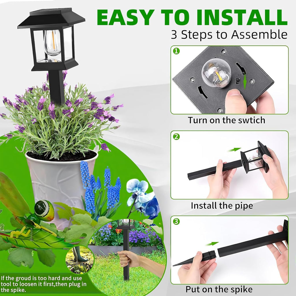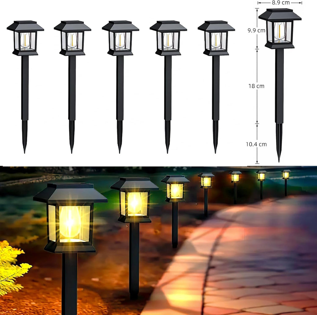 Bring elegance and brightness to your outdoors with this 6 Pack Solar Garden Pathway Lights, featuring Edison-style LED bulbs and high-transmittance lampshades that cast a stunning dappled lighting effect. These lights are more than just illumination—they also enhance the beauty of your garden, patio, driveway, or pathway.