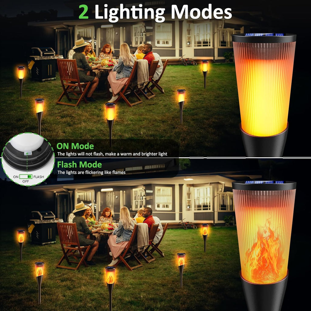 Powered by an upgraded polysilicon solar panel and a 600mAh rechargeable battery, these torch lights automatically charge during the day and turn on at dusk. After 6–8 hours of charging, they deliver 4–10 hours of illumination, making them perfect for decorating pathways, gardens, patios, yards, and even campsites.