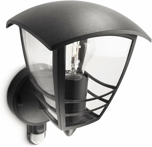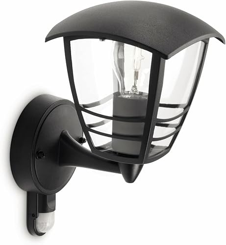 This outdoor wall light features a motion sensor for automatic activation. Compatible with a 60W E27 bulb, it operates at 220–240V and comes in a sleek black finish, ideal for home exteriors and garden security.