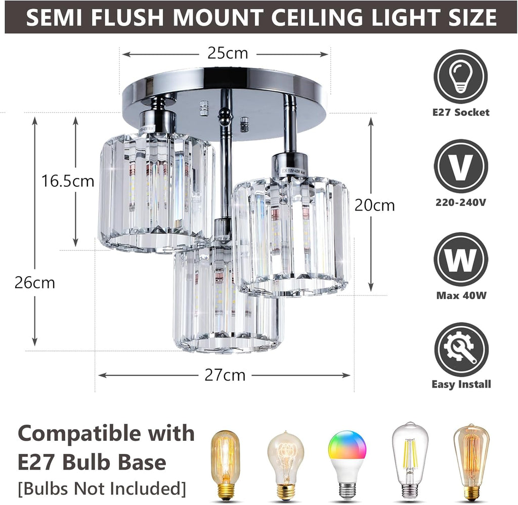 Elevate your home décor with this Modern Crystal Chandelier Ceiling Light, a perfect blend of luxury and functionality. Designed with 3 elegant crystal lampshades and a sleek chrome finish, this semi-flush ceiling light creates a sparkling ambiance in any room—be it your living room, bedroom, hallway, bathroom, kitchen, or foyer. Crafted to meet Energy Class A standards, it ensures beauty with efficiency. The shimmering crystals reflect light beautifully, offering a sophisticated charm and timeless elegance. Whether you’re redecorating or adding a touch of glam, this modern crystal light fitting makes a bold style statement while providing ample illumination.