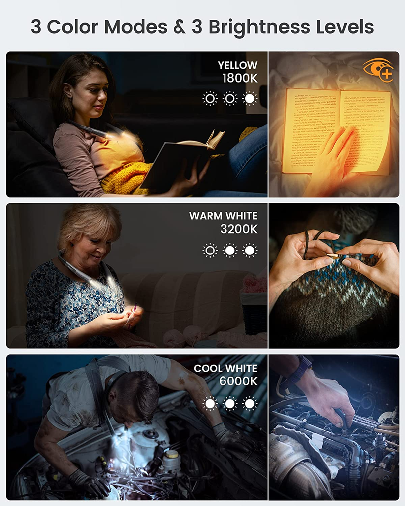 Multiple Lighting Modes: The Upgraded LED Neck Reading Light comes with multiple lighting modes, including white light, warm light, and a combination of both, providing you with the flexibility to adjust the lighting conditions to suit your needs.