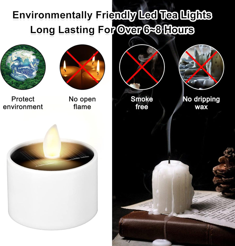 Each solar-powered candle charges during the day and automatically lights up at dusk, providing up to 6–8 hours of soft illumination. Made from high-quality ABS material with a polycrystalline silicon solar panel, they’re both durable and energy-efficient.