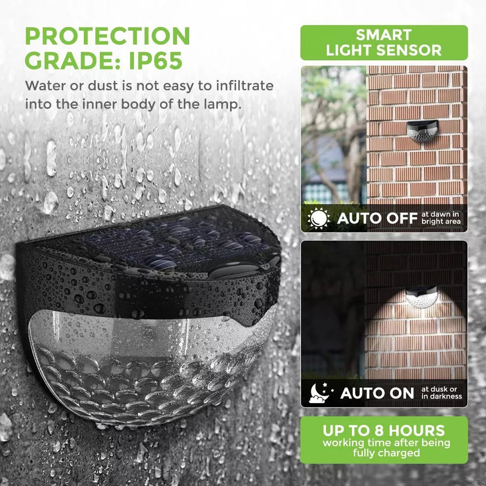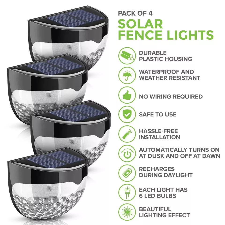 These 4 Pack Super Bright Solar-Powered LED Fence Lights are designed to illuminate your outdoor spaces with ease. Each light features a sleek, black plastic housing and a reliable solar-powered LED system, making them perfect for enhancing your garden, fence, or wall. With an automatic control style, these lights turn on at dusk and off at dawn, offering hassle-free operation. Ideal for outdoor areas like patios and pathways, they provide soft, ambient lighting without the need for electrical wiring.
