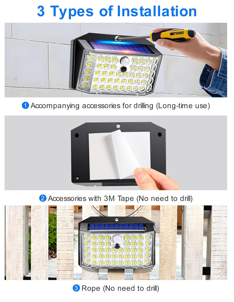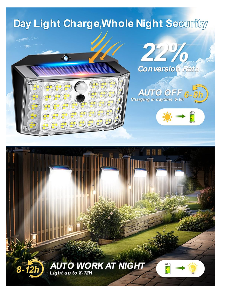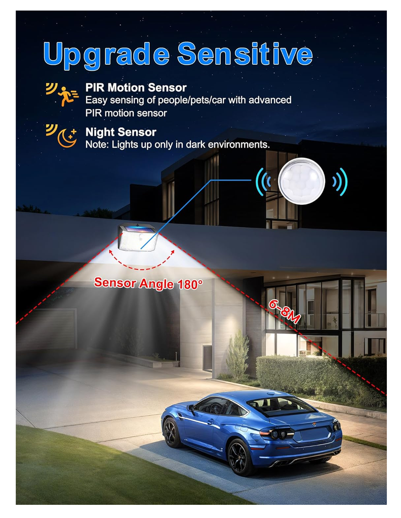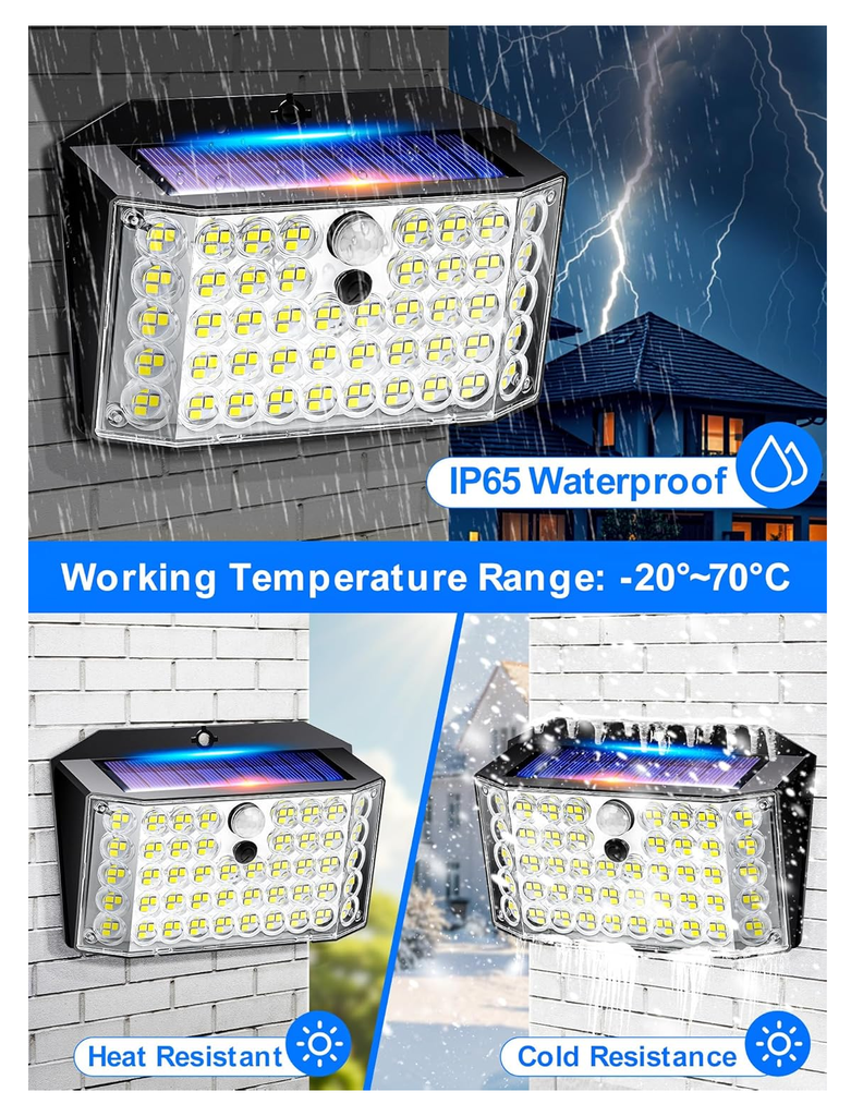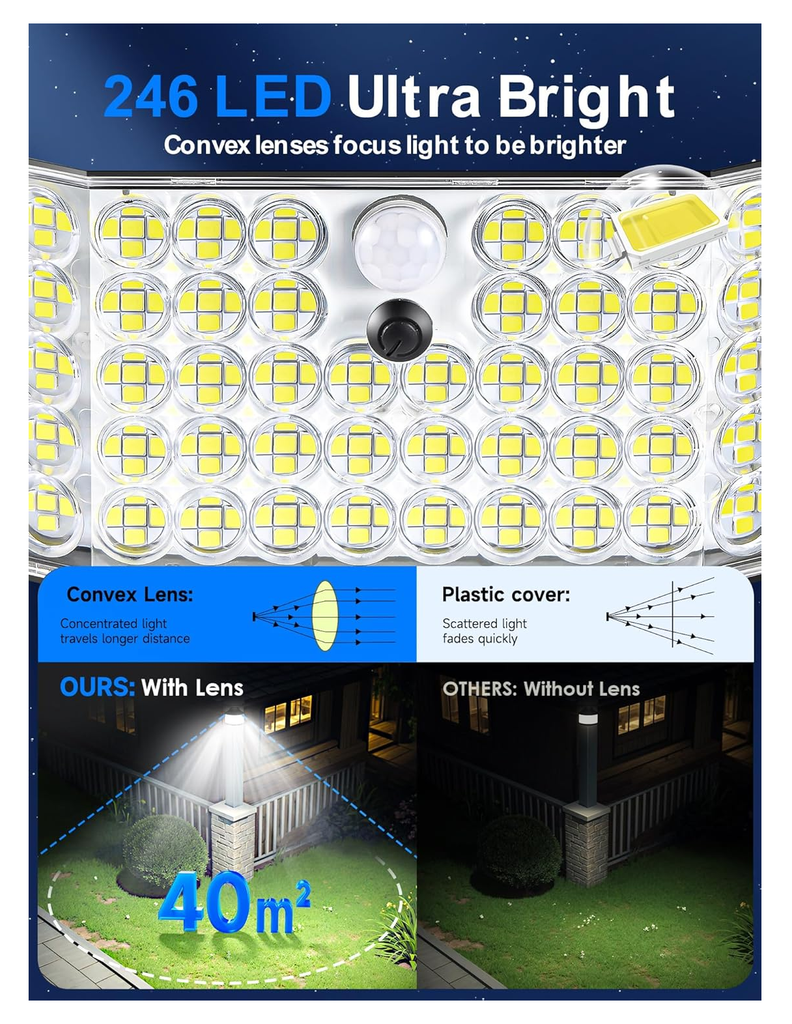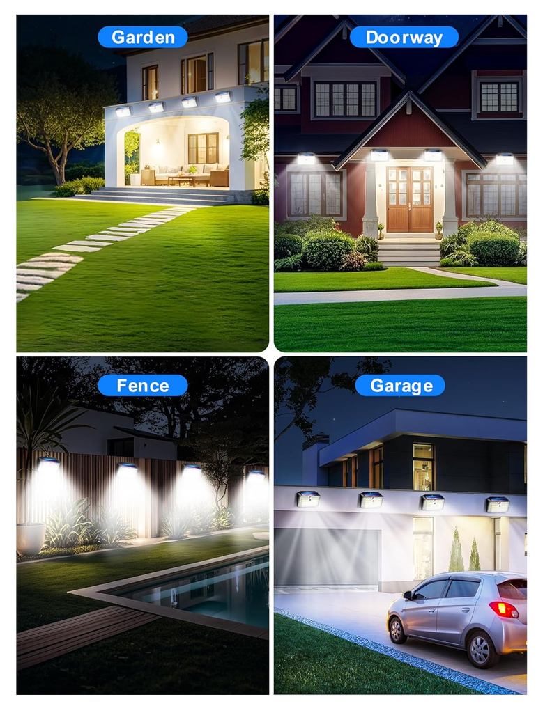 Upgrade your outdoor lighting with this 4-pack of Solar Detection Security Lights, equipped with 246 ultra-bright LEDs per unit. Each light delivers 2000 lumens of output with 270° wide-angle coverage, ideal for large outdoor areas. With IP65 waterproof protection and motion-activated functionality, these wall-mount lights are perfect for driveways, gardens, and patios.