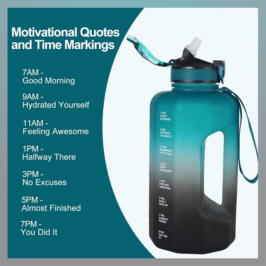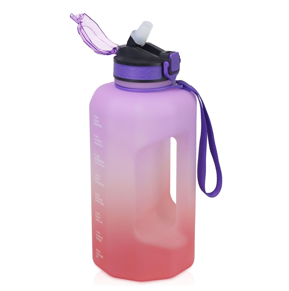 The bottle features motivational time markings to help you track your daily water intake, keeping you refreshed and energized during workouts, hikes, or commutes. Its leakproof lid, wide-mouth opening, and comfortable carry handle make it easy to fill, clean, and carry anywhere.