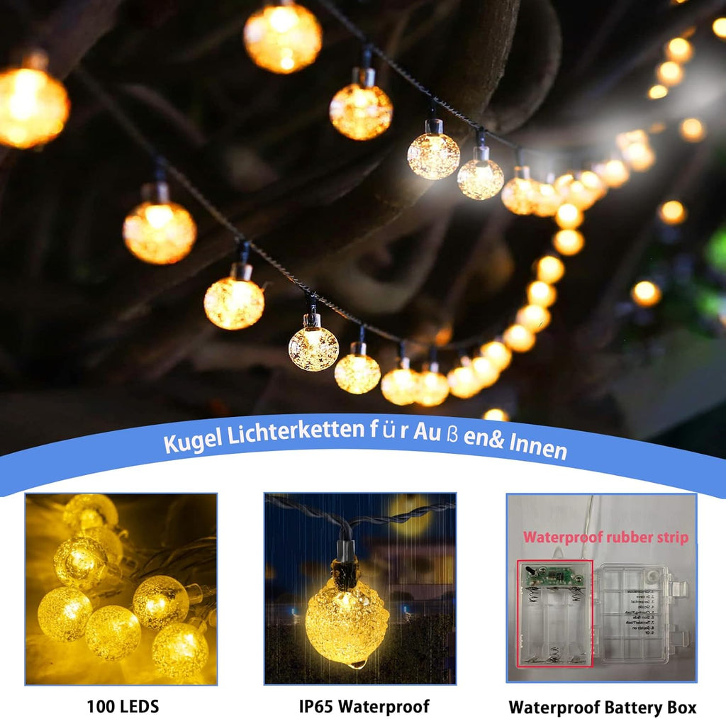 Create a warm, enchanting atmosphere with these 10-meter battery-operated globe fairy lights. Featuring 100 ultra-bright LEDs encased in 15mm crystal-style globes, these lights offer 8 twinkling modes, a handy remote, timer function, and IP65 waterproof protection. Ideal for indoor and outdoor use, they’re perfect for patios, balconies, gardens, parties, weddings, and cozy evenings at home.