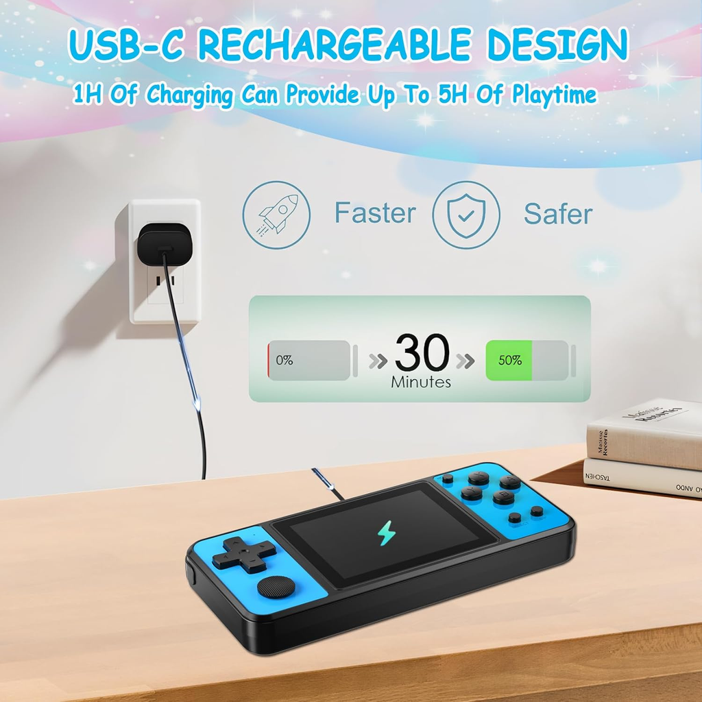 The console features a 3.0-inch IPS color display that delivers crisp visuals and vibrant colors, ensuring a fun and immersive gaming experience. Its rechargeable lithium battery provides long-lasting playtime and can be conveniently charged using a USB cable — perfect for travel, car rides, or home use.