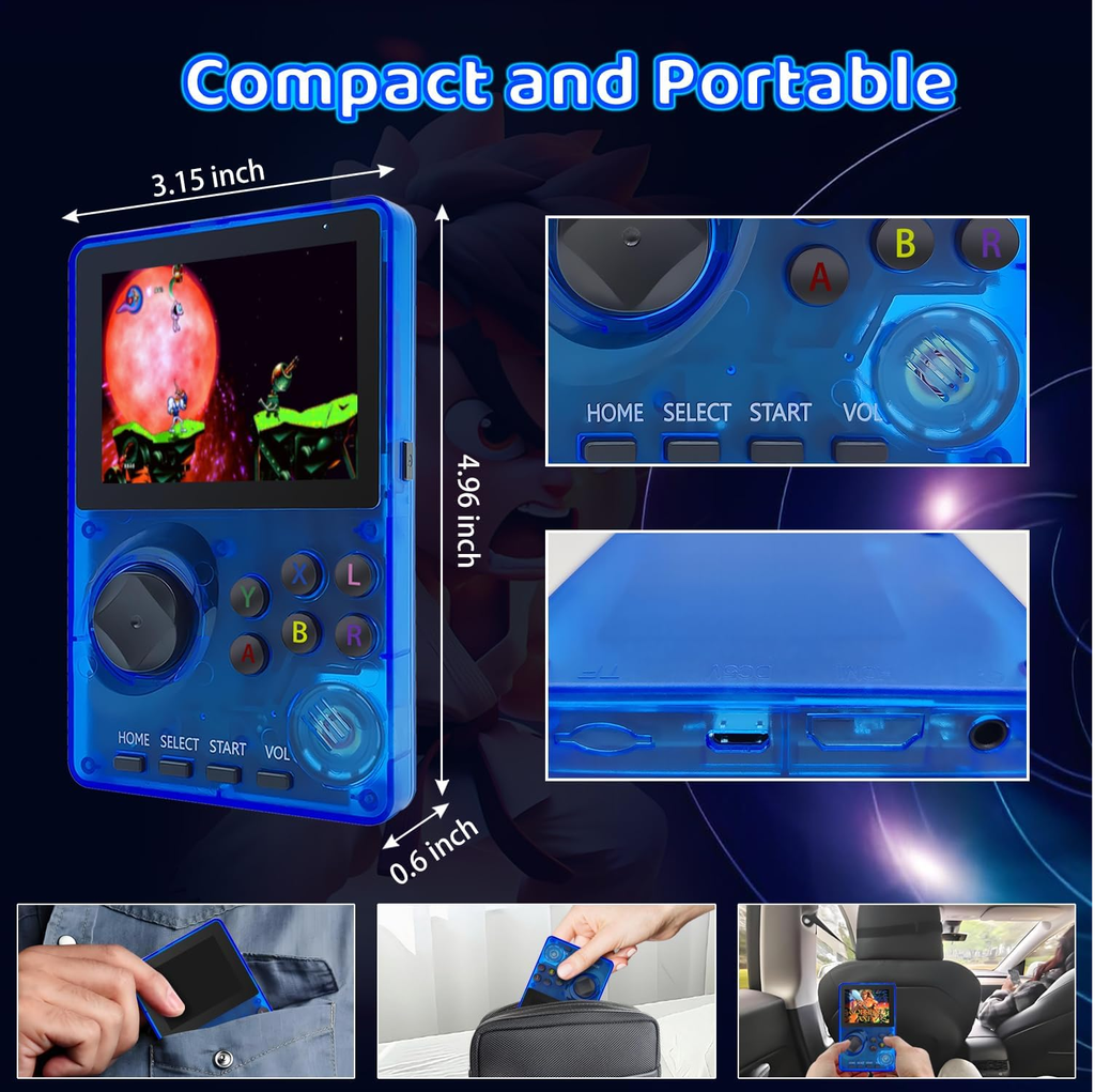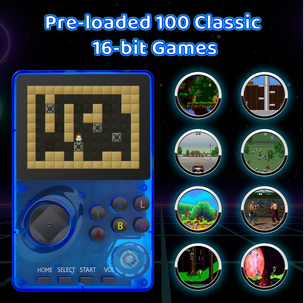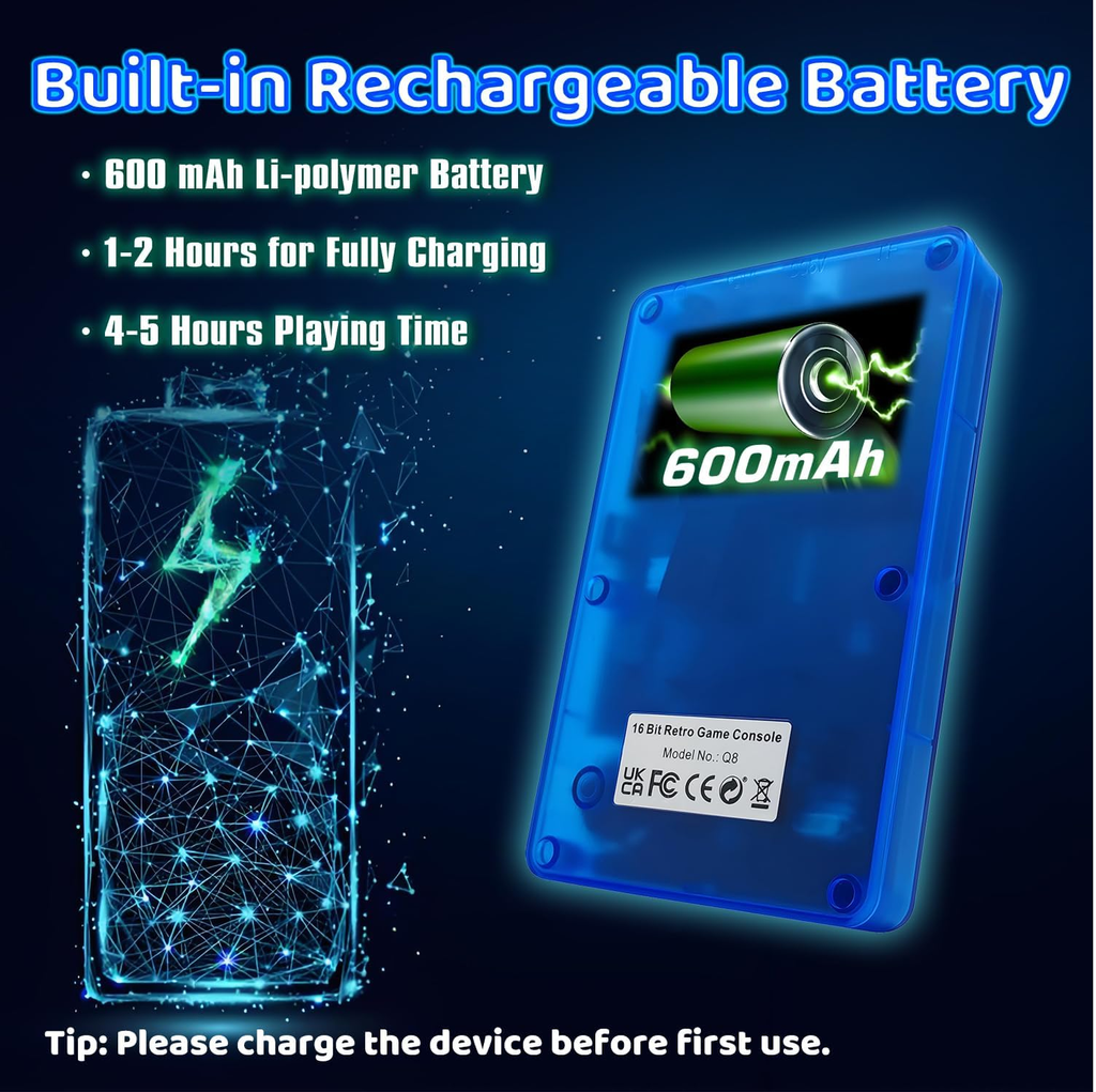 Designed with a transparent blue casing for a cool, retro aesthetic, this handheld console combines vintage style with modern convenience. The rechargeable lithium battery provides hours of continuous play and can easily be recharged via USB, making it perfect for travel, road trips, or quiet evenings at home.