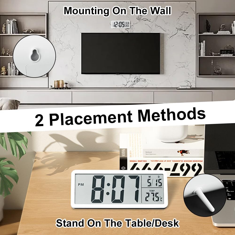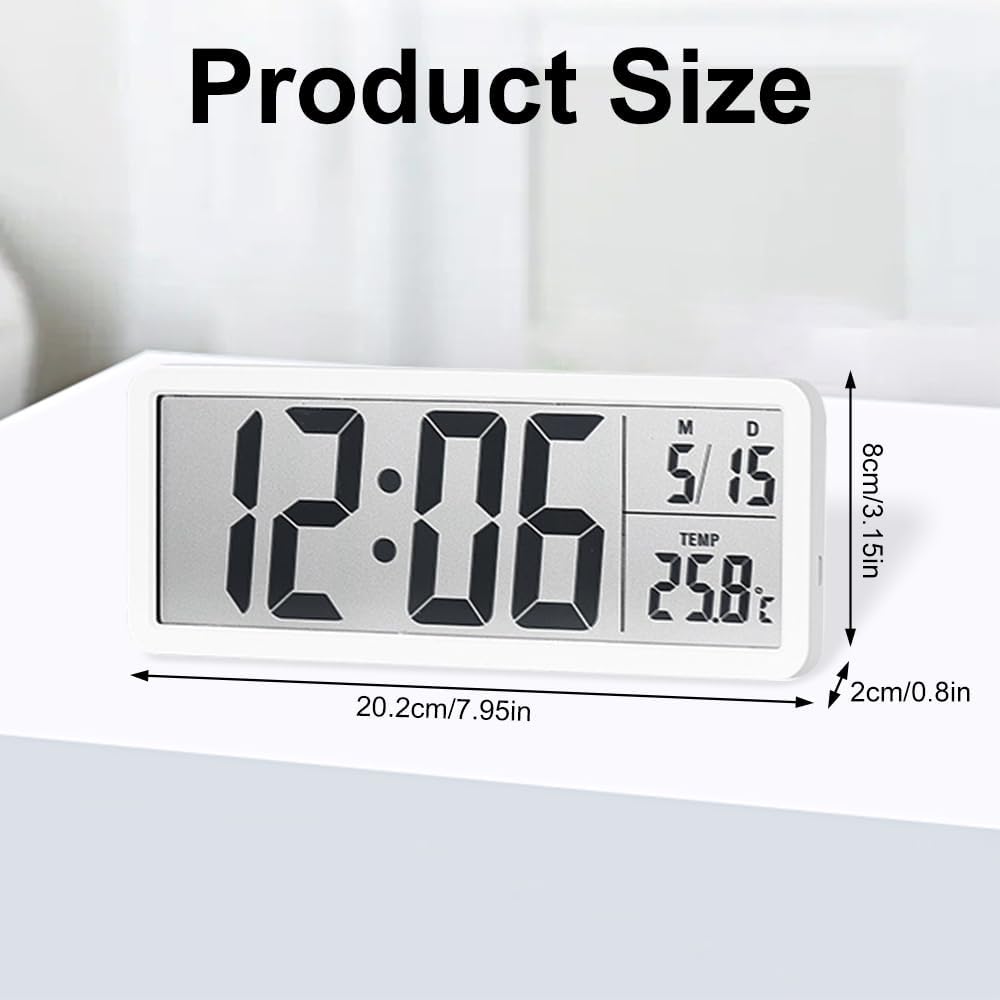 Upgrade your space with the 8'' LCD Digital Wall Clock, a perfect blend of modern functionality and elegant simplicity. This digital wall clock features a large, high-contrast LCD screen that displays the time, date, and indoor temperature clearly, ensuring excellent readability from any distance. Designed for versatility, it can be mounted on the wall or placed on a desk or shelf, making it suitable for the living room, bedroom, kitchen, office, or classroom.