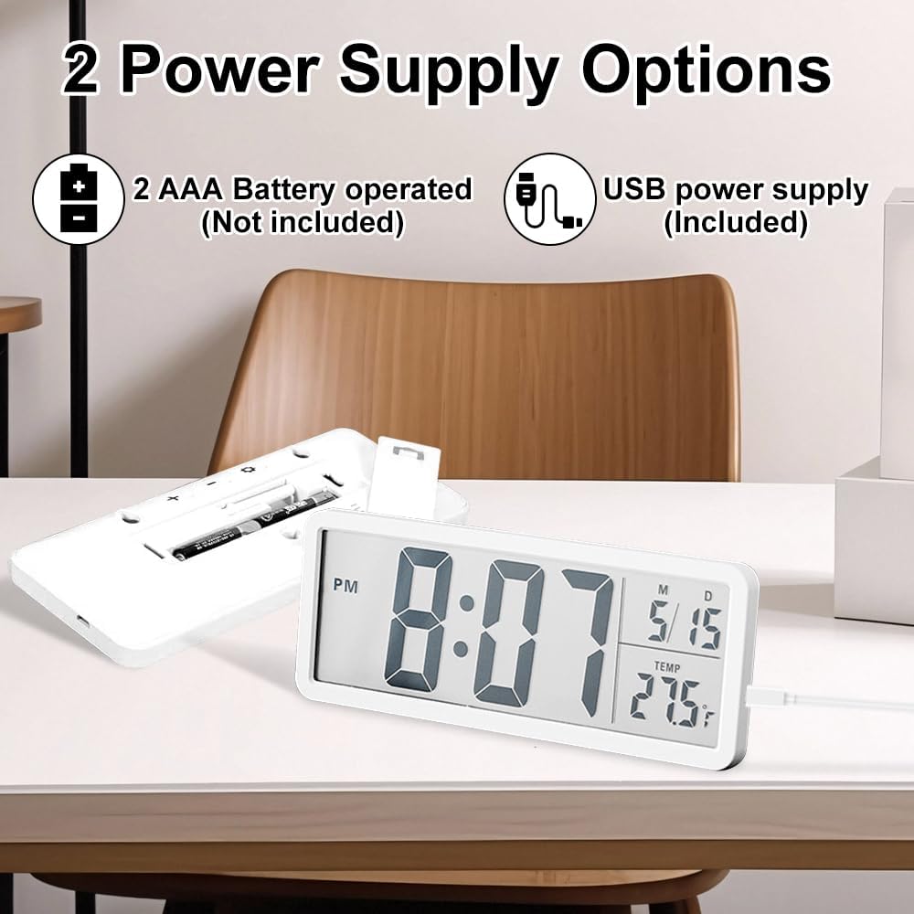 The clock supports dual power options—battery operation for portability and USB power for continuous use—offering convenience in any setting. It also includes 12/24-hour time format and Celsius/Fahrenheit temperature display options, allowing you to customize the settings to your preference. With its silent operation, this clock provides accurate timekeeping without any ticking noise, ensuring a peaceful environment. Its minimalist and contemporary design complements any interior décor, adding a functional yet stylish touch to your space.
