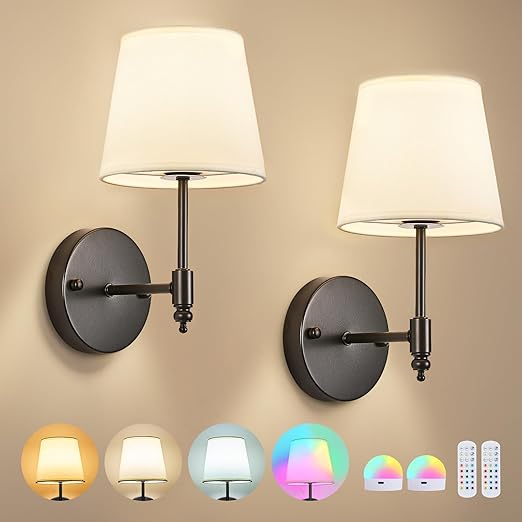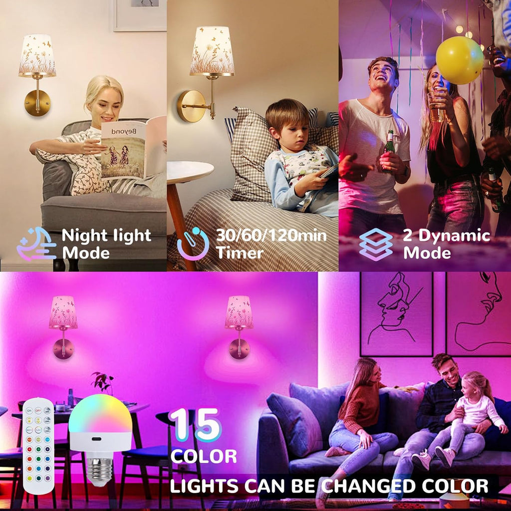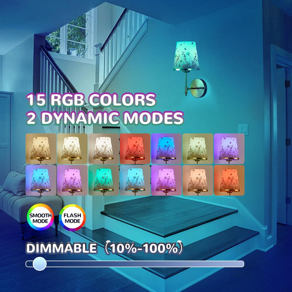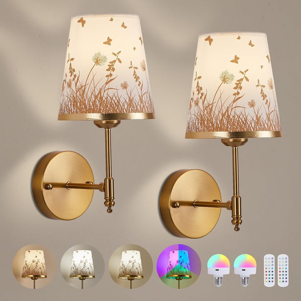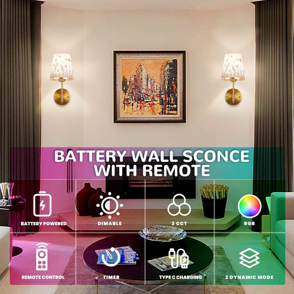 Add a touch of elegance and freedom to your lighting with this Battery Operated Wall Sconce Set of 2. Designed with stunning Chinese floral and bird motifs on handcrafted fabric shades, these wireless wall lights are perfect for renters or anyone looking for hassle-free, wiring-free illumination. With RGB color options, remote control, dimmable settings, and a sleek gold finish, these sconces are as versatile as they are beautiful.