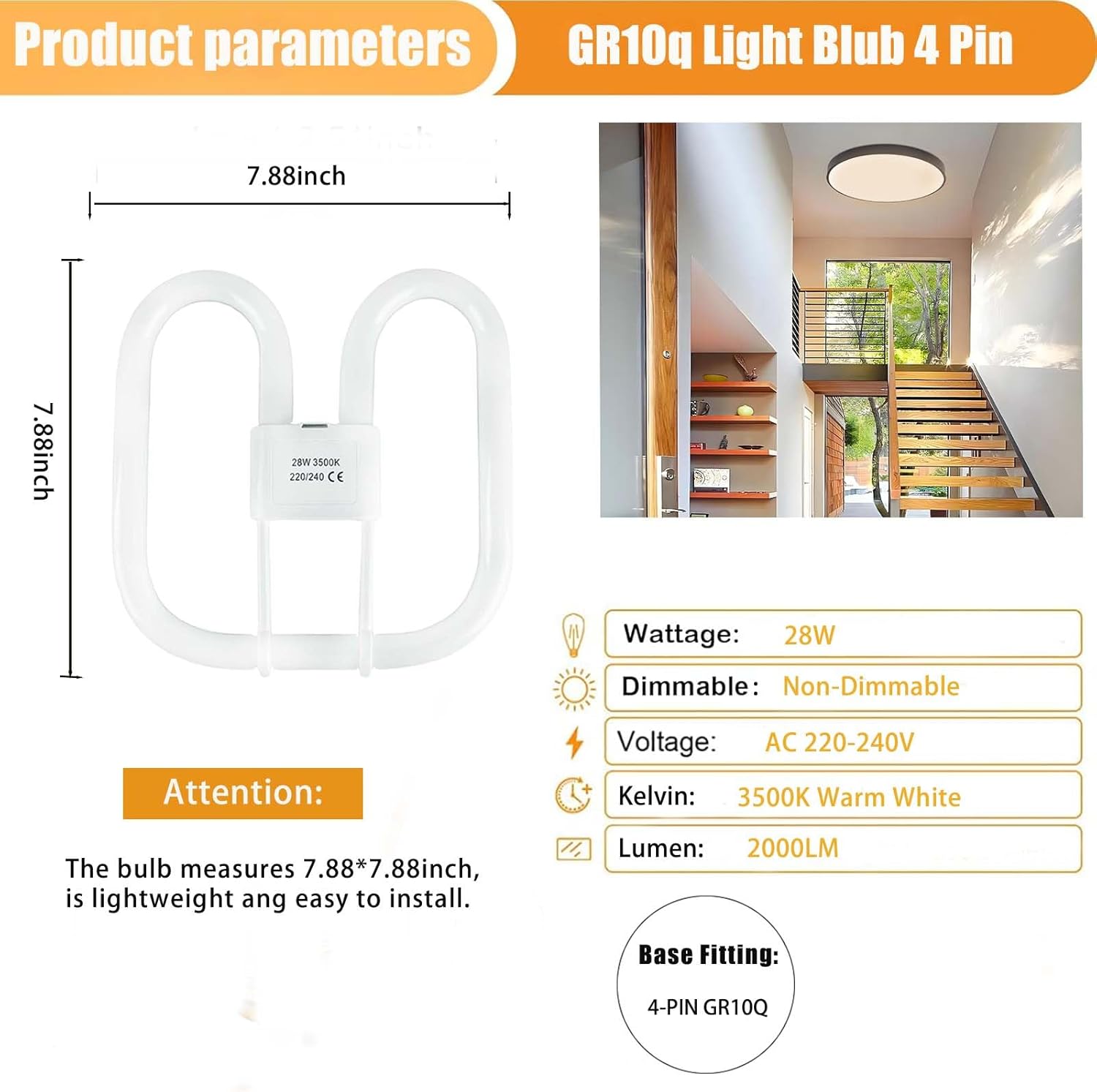 28W GR10Q 4-Pin Compact Fluorescent Lamp, Warm White 3500K CFL Bulb, Non-Dimmable, Energy-Saving Light for Ceiling Fixtures, AC 220V
