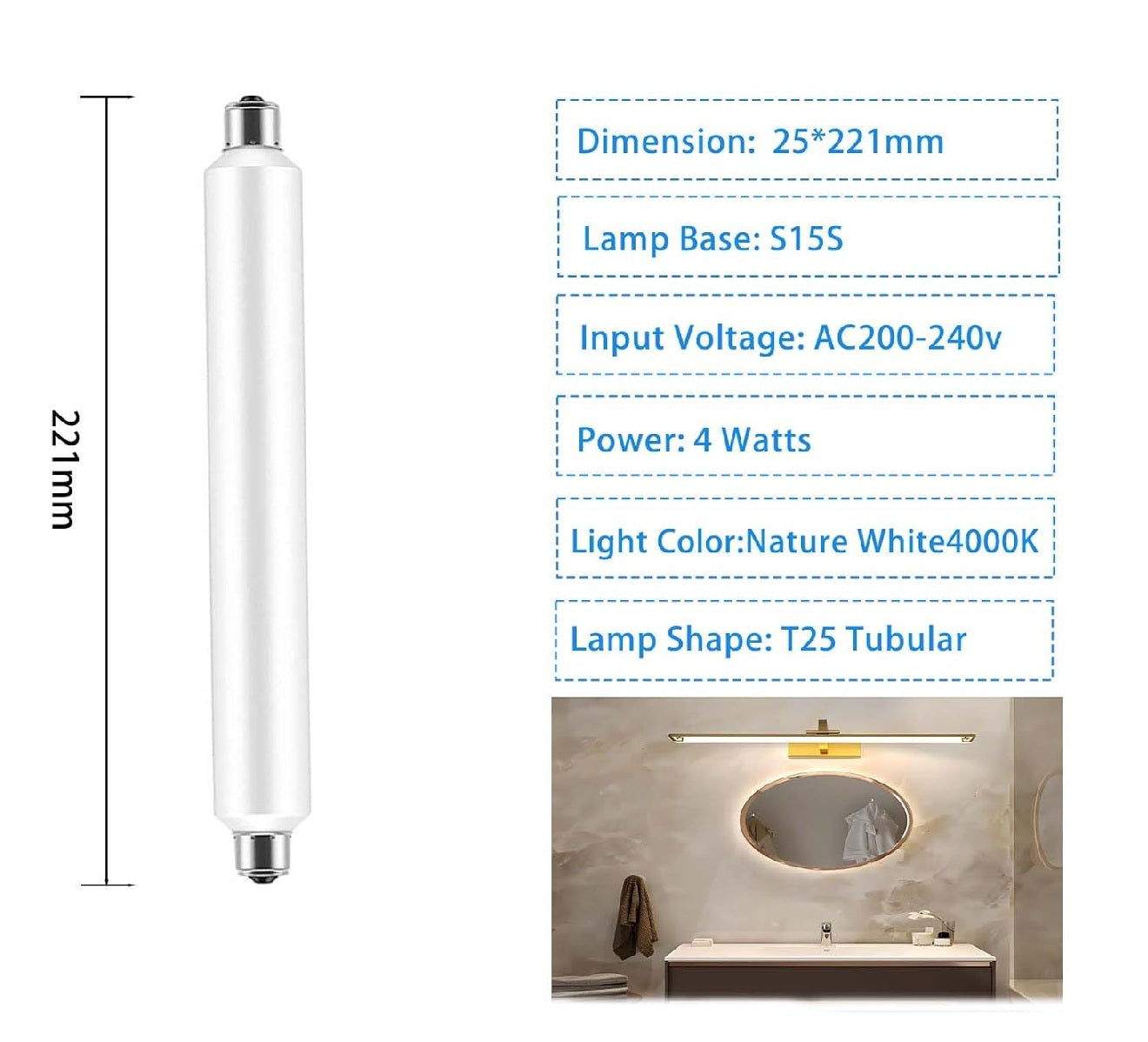 The 4W LED S15s Strip Light is a non-dimmable, energy-efficient replacement for traditional 40W incandescent or halogen bulbs. Designed with a T25 double-ended S15 cap base and measuring 221mm, it is easy to install and operates on AC200-240V, making it a reliable fit for a variety of fixtures. Featuring super-bright SMD chips and a 180° beam angle, this bulb provides clear, even lighting while producing minimal heat. With CE safety approval and a long lifespan of up to 35,000 hours, it offers 85% energy savings, making it an eco-friendly choice. Ideal for picture lights, shaving mirrors, under-cabinet lighting, kitchen fittings, and shaver lamps, this LED strip light is perfect for enhancing both functionality and ambiance in your home.