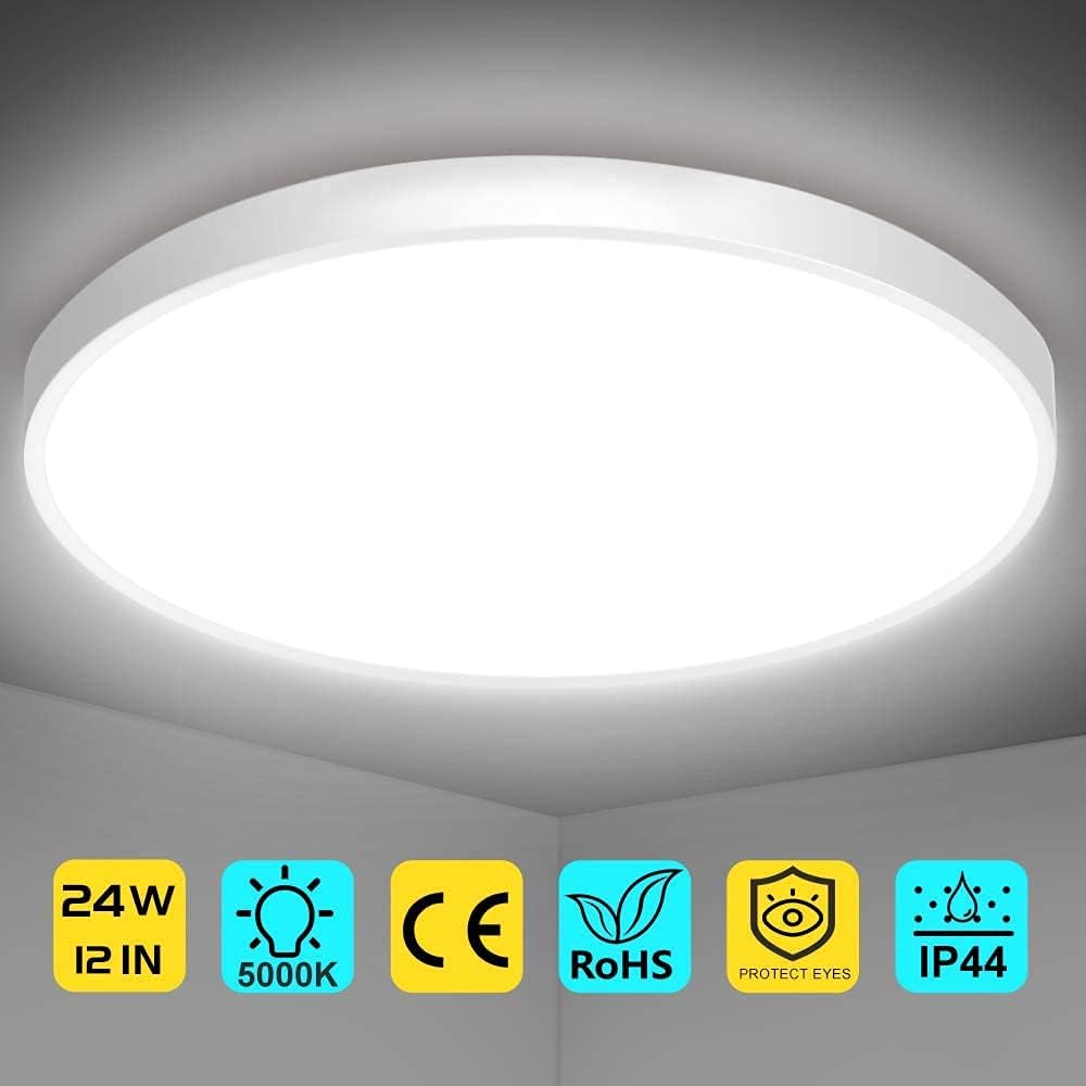 Enhance your home lighting with this 2-pack of 12-inch LED Flush Mount Ceiling Light Fixtures, designed with a sleek, ultra-thin profile at just 0.94 inches thick. Each light delivers 24W of energy-efficient brightness, equivalent to a traditional 240W bulb, with a stunning 3200 lumens output in crisp 5000K daylight white. Ideal for kitchens, stairwells, hallways, and bedrooms, these modern round lights provide even, flicker-free illumination that’s gentle on the eyes. The rust-proof white finish and flat design complement any decor. With a lifespan of over 10 years, these LED ceiling lights offer reliable performance and effortless elegance for everyday use.