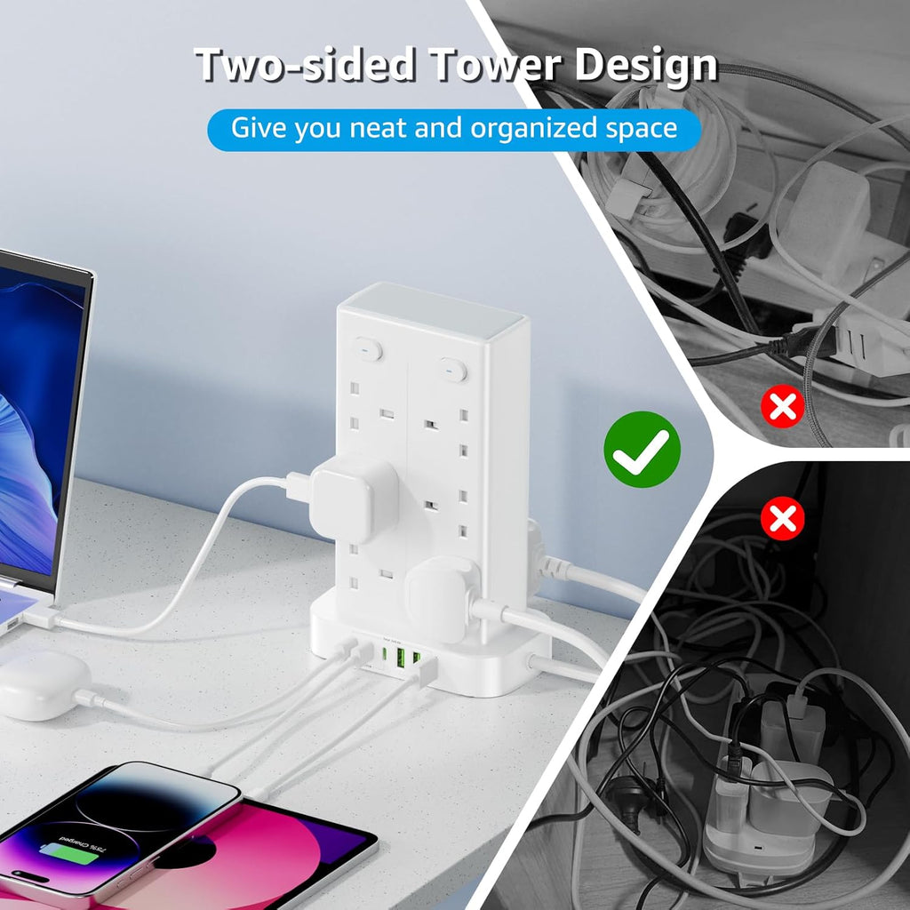 Built with advanced overload and surge protection, this tower ensures the safety of all your connected devices by automatically cutting off power in case of excessive current or voltage fluctuations. The 3-meter heavy-duty power cord offers flexibility and reach, making it ideal for home offices, entertainment centers, and workstations.