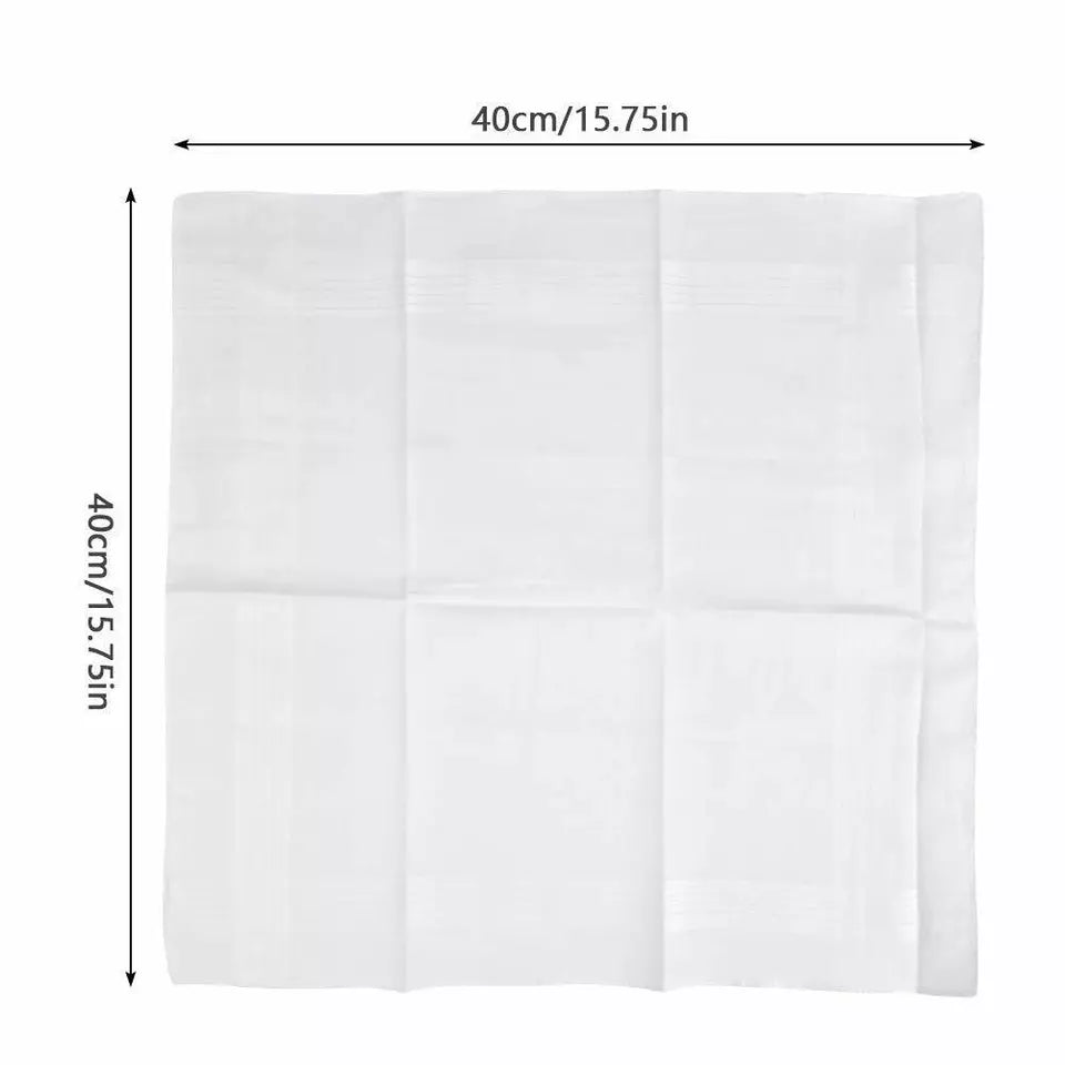Each handkerchief measures approximately 16 x 16 inches (40 x 40 cm), providing ample size for various uses. The plain white design with neatly hemmed edges adds a touch of timeless elegance, making them suitable for both casual and formal settings.