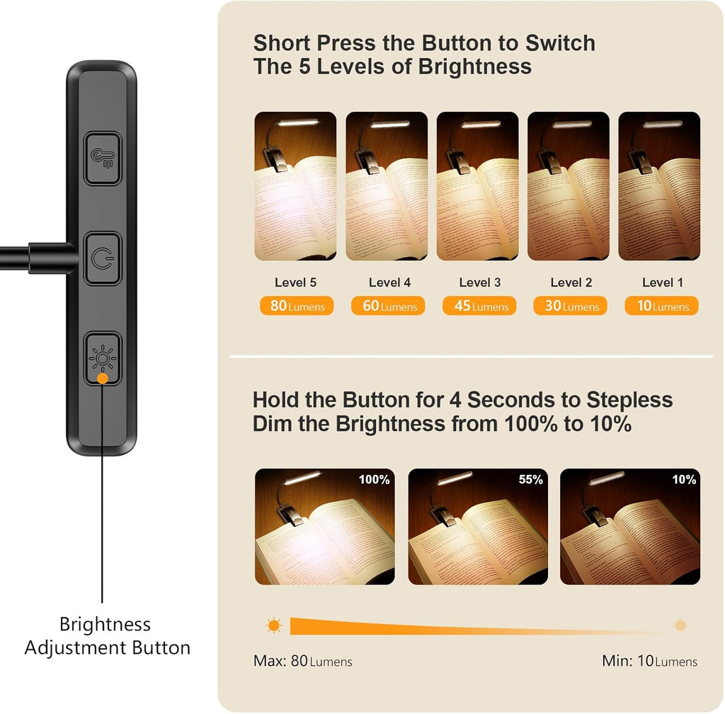 Enjoy your nighttime reading without straining your eyes or disturbing others using this 19 LED Rechargeable Book Light. Designed with a wide horizontal head, stepless dimming, memory function, and three eye-friendly color modes, this portable and powerful light is perfect for beds, books, tablets, and more.