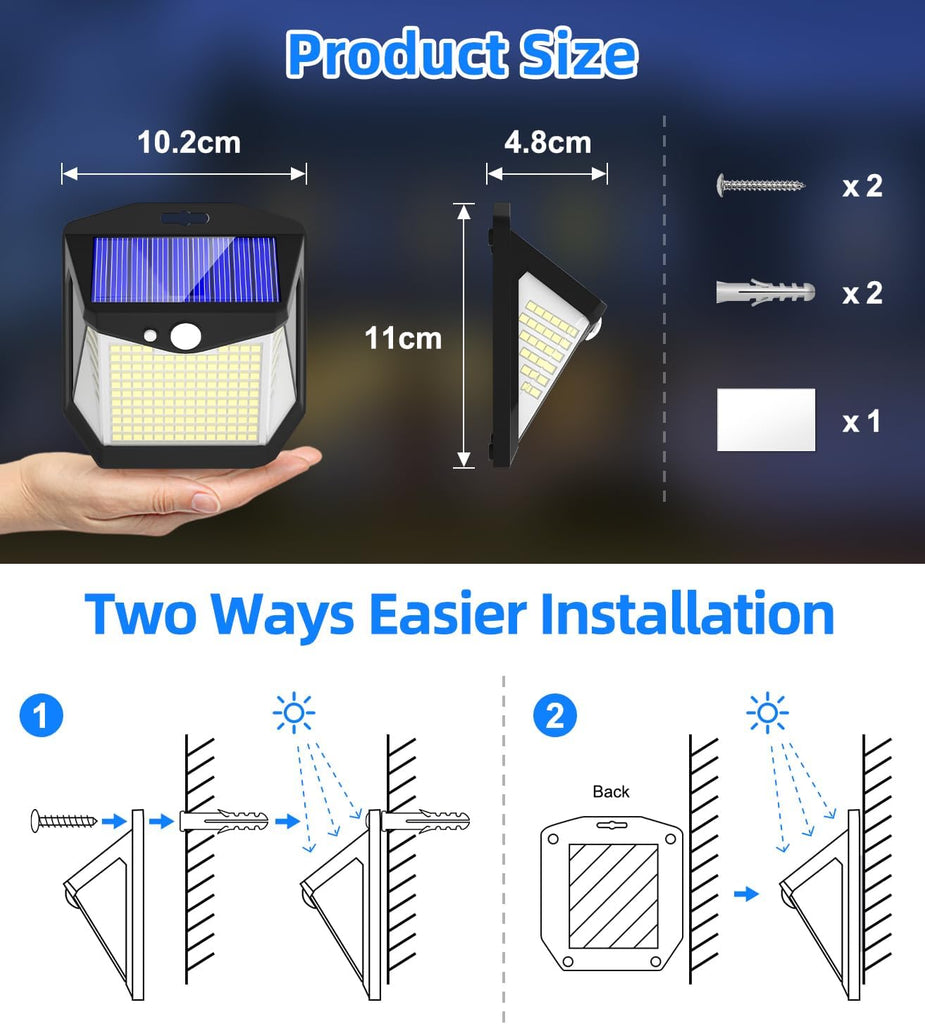Upgrade your outdoor lighting with the 238 LED Solar Motion Sensor Lights designed to brighten your garden, patio, or garage with unparalleled efficiency and style. Featuring 238 ultra-bright LEDs and a 270° wide-angle lighting design, these solar-powered lights offer comprehensive illumination for any outdoor space. Equipped with a 1200mAh rechargeable battery, these lights store solar energy during the day, providing reliable performance through the night.